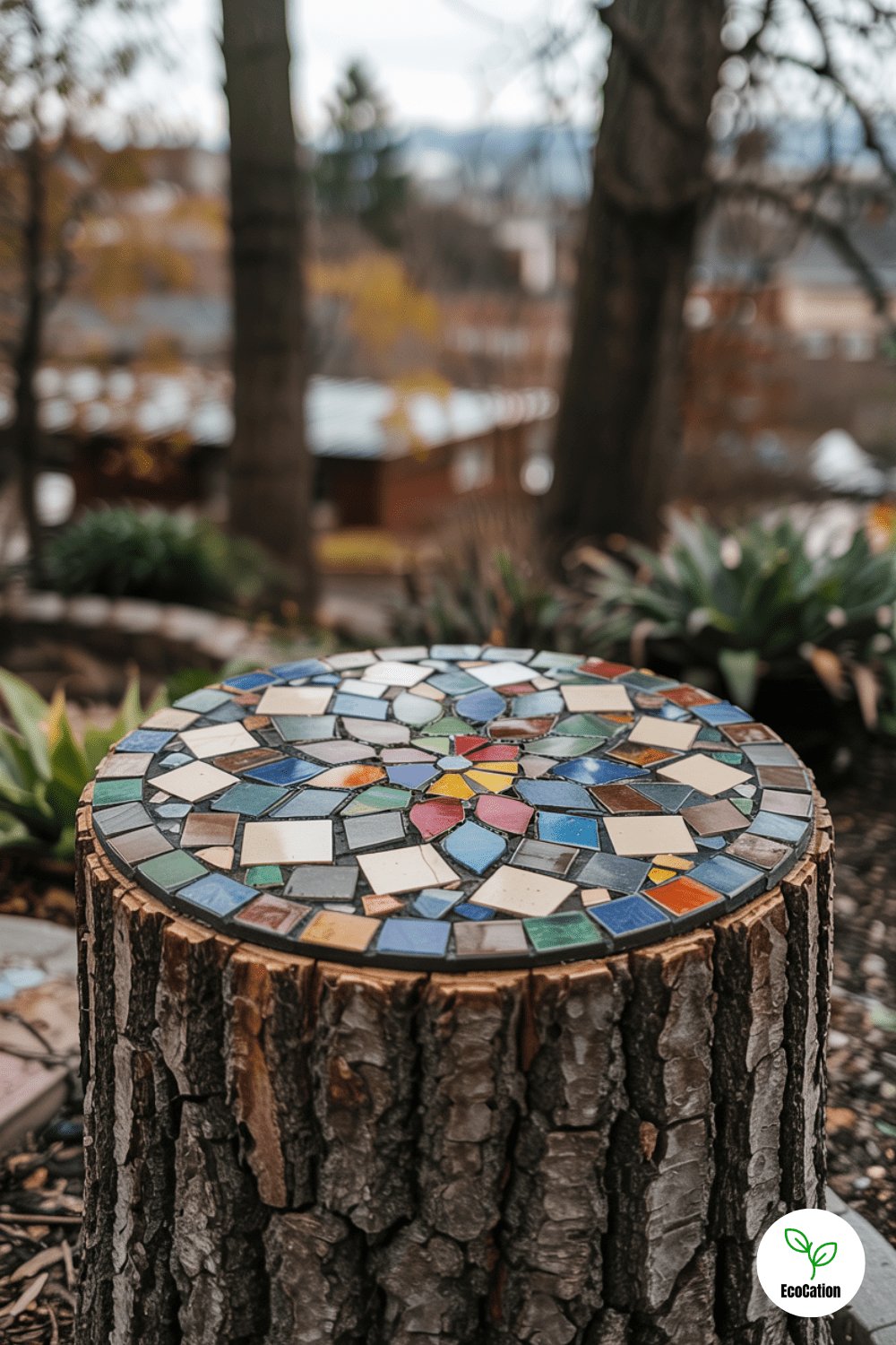 Turn a boring stump into dazzling garden art with broken tiles, glass, or pottery. Create patterns, pictures, or abstract designs using outdoor-grade adhesive and grout. This is a great way to repurpose chipped dishes or leftover tile from home projects. The colorful surface will brighten your yard year-round and stand up to weather when properly sealed.