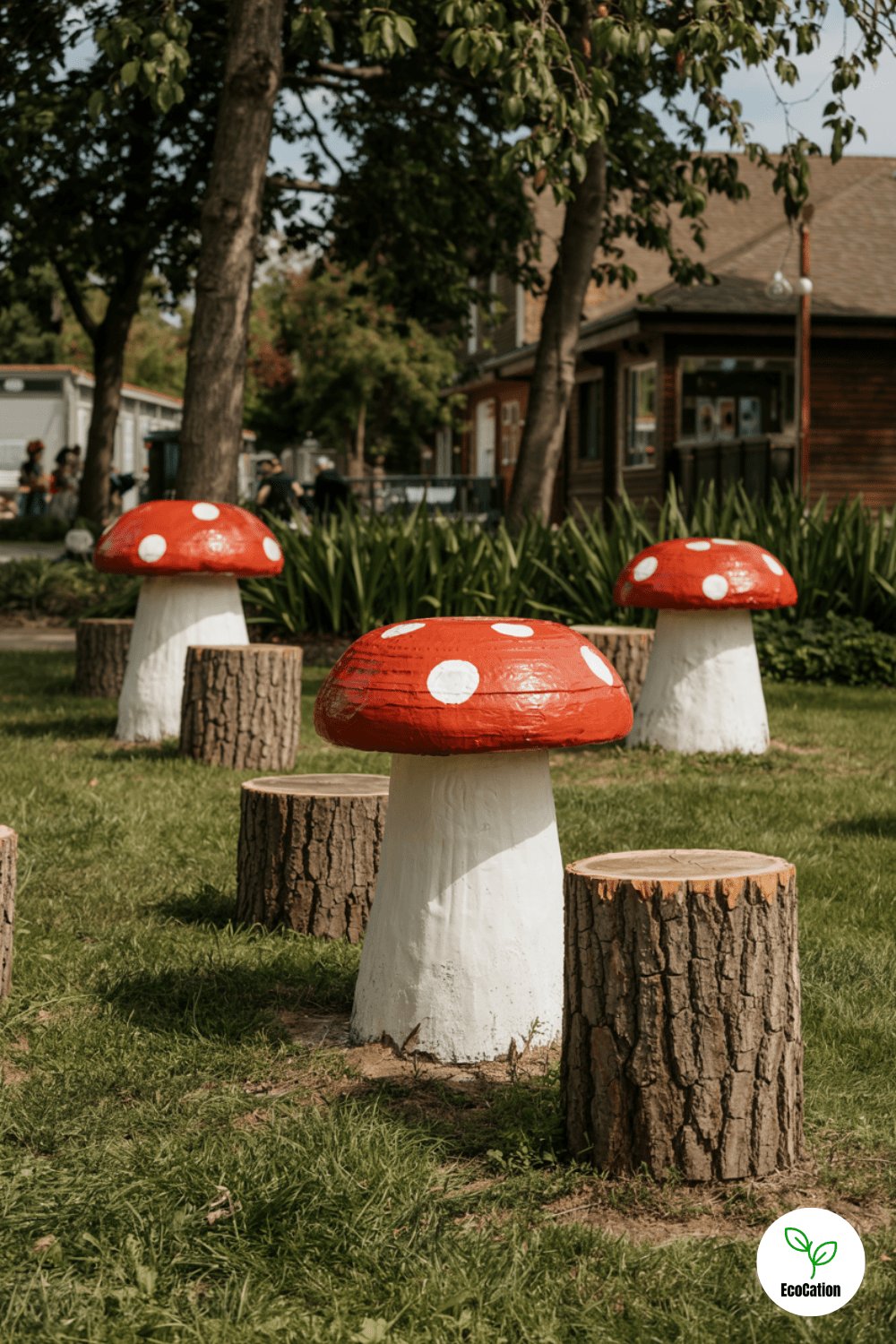 Delight the kids (and kids-at-heart) by painting stumps to look like giant mushrooms. Use bright red tops with white dots for classic toadstool style, then seal with weatherproof finish. Arrange them in a circle to create a storybook seating area, or scatter them along a garden path for playful surprises. The smooth painted surfaces wipe clean easily after rain.