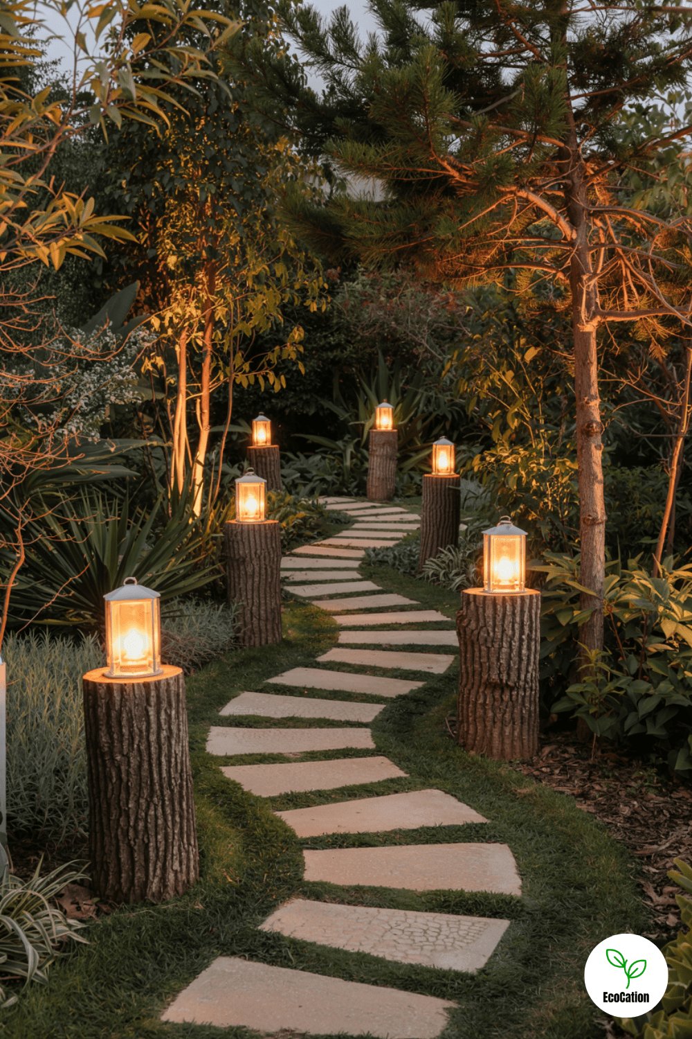 Line your garden walkway with stumps topped with solar-powered lanterns for enchanting nighttime illumination. Choose stumps of varying heights for visual interest, and space them evenly for both safety and style. The soft glow will guide guests while creating a magical atmosphere. For winter, swap the lanterns for evergreen arrangements or festive lights.