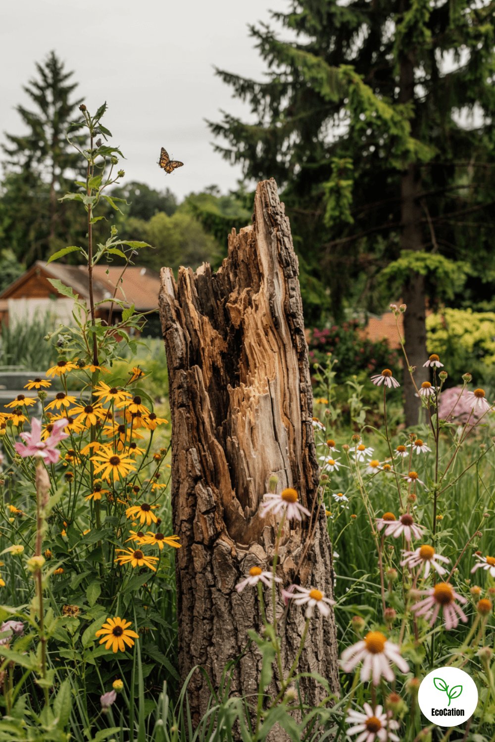 Turn a tall stump into a butterfly magnet by positioning it in a sunny wildflower patch. The elevated surface gives butterflies a safe place to rest and warm their wings. Surround it with nectar-rich plants like coneflowers, milkweed, and lavender. Leave some rough bark texture intact butterflies use it to grip while feeding.
