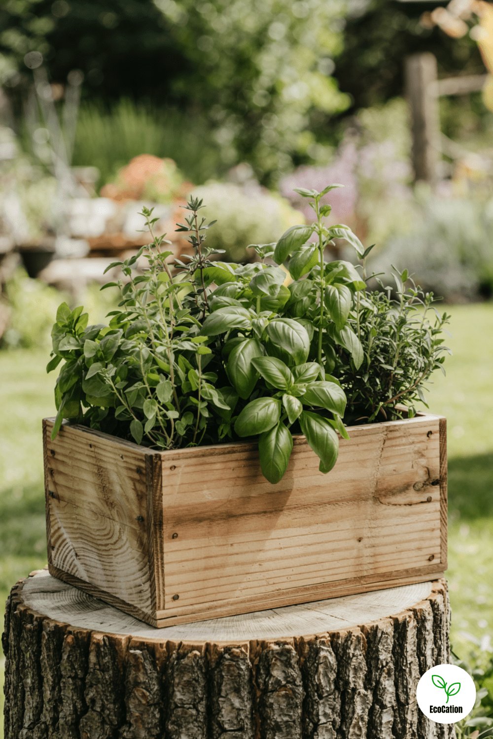 Elevate your cooking herbs by planting them in a box atop a flat stump. The height deters pests and makes harvesting easier on your back. Choose sun-loving varieties like rosemary, sage, and thyme for best results. Group herbs with similar water needs together, and refresh the soil annually to keep plants productive. Fresh flavors are just steps from your kitchen!