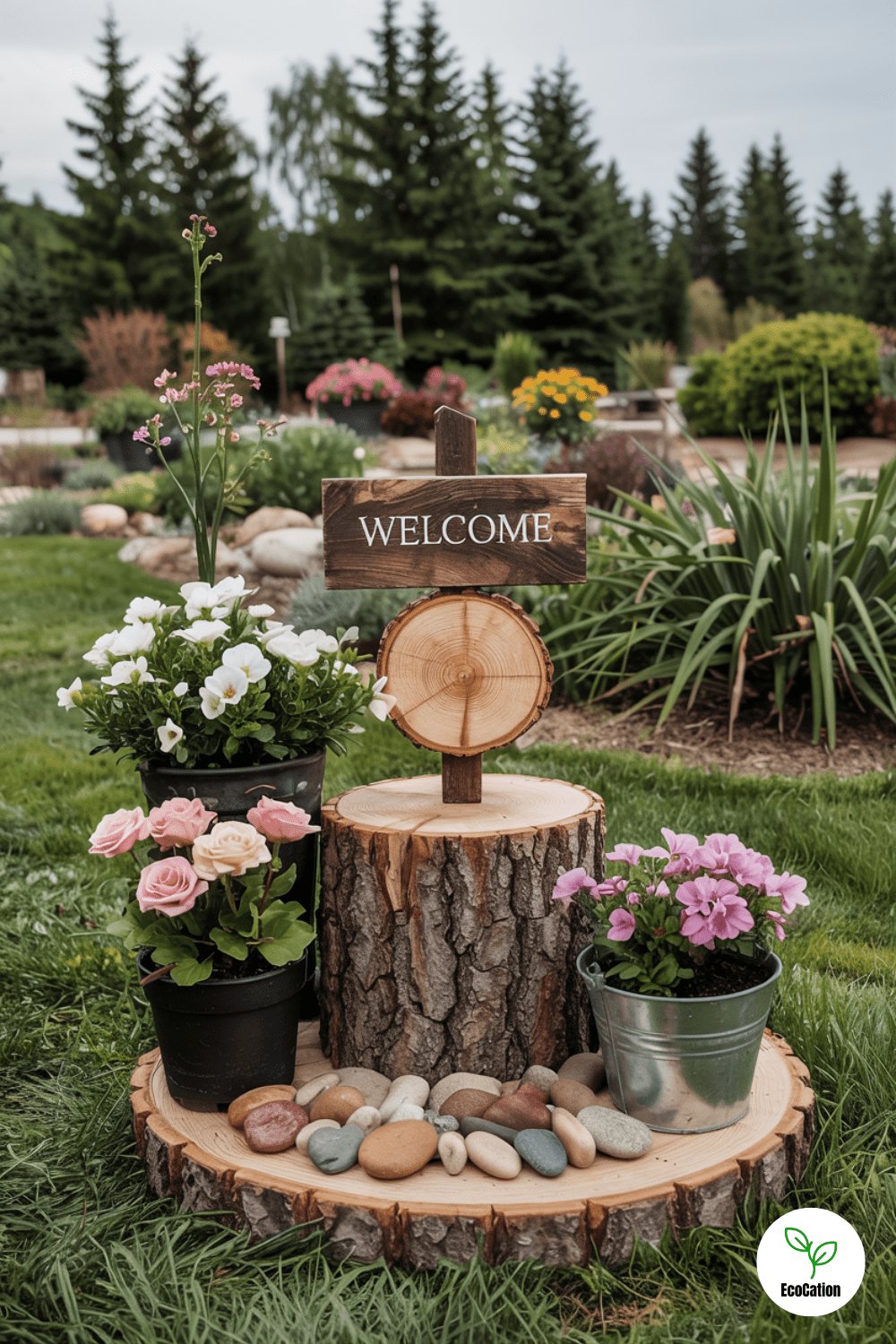 Make guests feel invited by mounting a charming wooden sign on a short, sturdy stump near your entrance. Choose a stump with interesting natural shape or texture to add character. Surround the base with seasonal flowers or evergreen shrubs for year-round appeal. Personalize the sign with your family name, house number, or a warm greeting message.