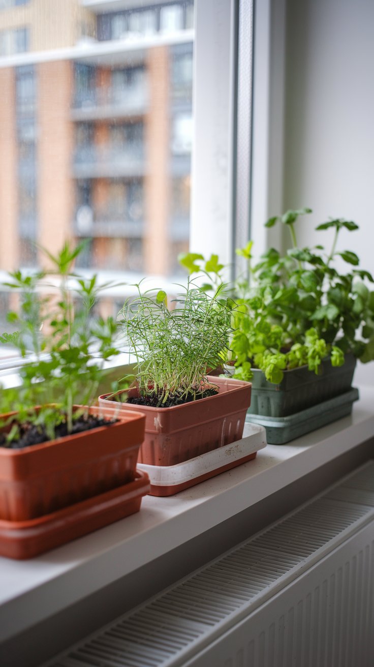 Bring freshness to your urban apartment with small potted herbs like parsley, cilantro, and chives on your windowsill. Use matching pots for a cohesive look and ensure the herbs get at least six hours of sunlight daily. Rotate pots to encourage even growth.