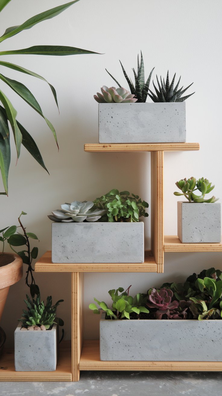 Add a minimalist touch to your home with succulents planted in chic concrete planters. Arrange them on wooden shelves for an earthy vibe. Use a mix of shapes and colors to create a dynamic display. Opt for low-maintenance varieties like echeveria or jade plants for a fuss-free indoor garden.