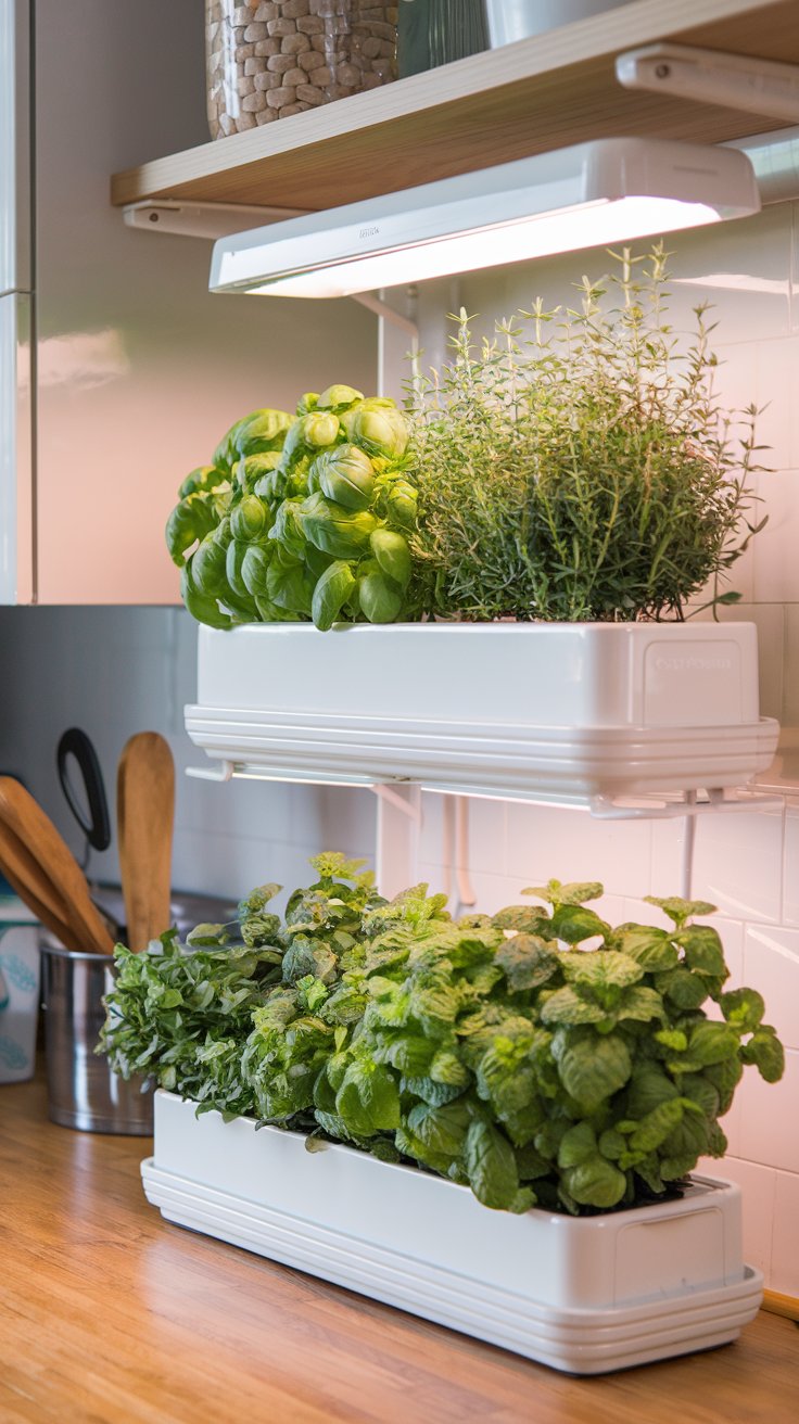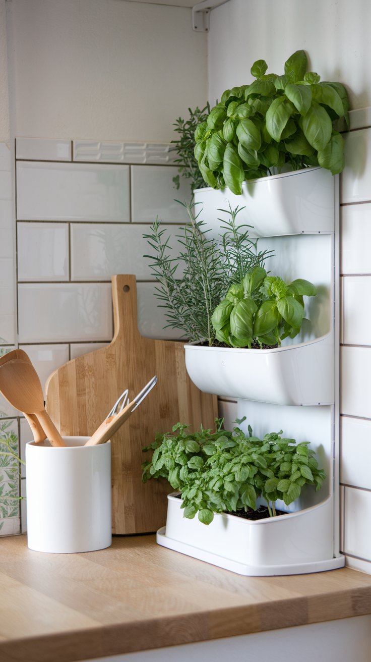 Turn your kitchen corner into a fresh haven with a sleek vertical herb garden. Grow aromatic herbs like basil, rosemary, and thyme in elegant white pots mounted vertically to save space. Keep the area near a sunny window or use grow lights for optimal results. Rotate your herbs weekly to ensure even growth and use organic soil to enhance their flavor.
