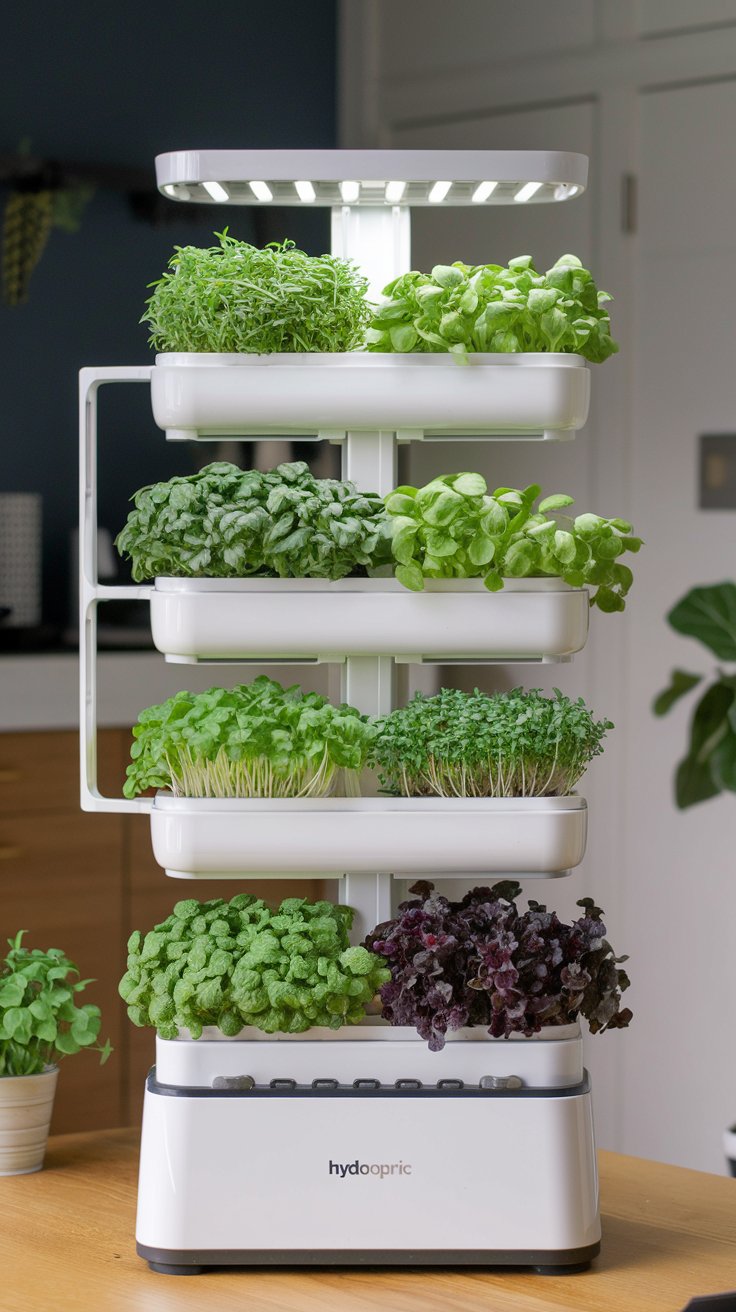 Enjoy year-round gardening with a hydroponic tower for herbs and microgreens. This soil-free system is ideal for small apartments and ensures consistent growth. Keep the tower near an outlet for the built-in lighting and watering system.