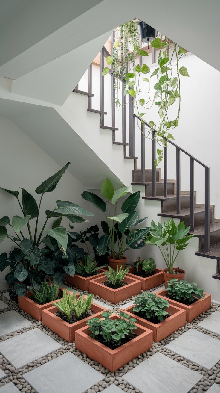 Arrange potted plants in geometric patterns under your stairs for a modern garden look. Use pots of varying sizes and shapes to add depth. Include hardy plants like ferns and succulents to thrive in low-light conditions.