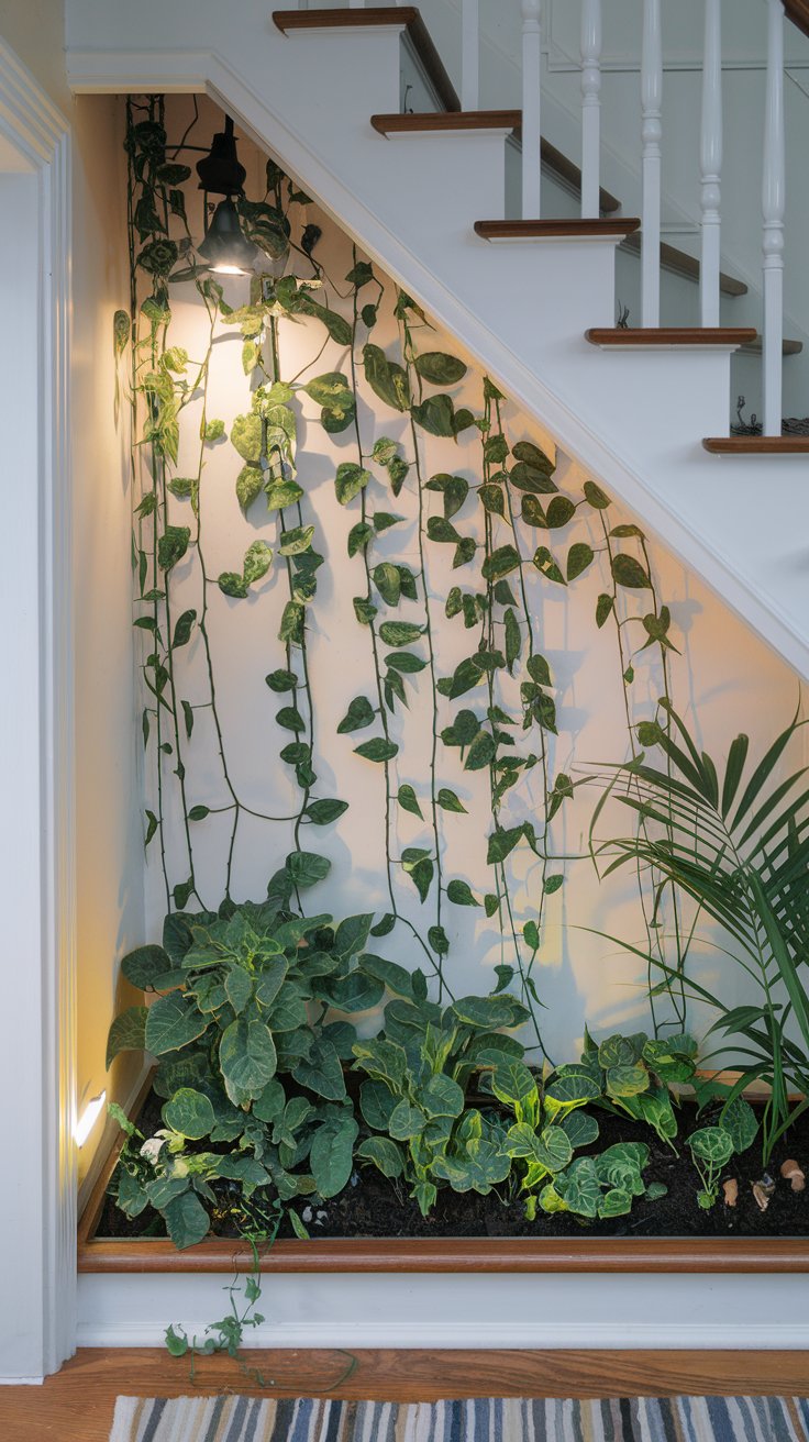 Turn the space under your stairs into a tranquil garden with cascading vines and soft LED lighting. Use trailing plants like pothos or philodendron for dramatic effect. Add small, colorful pots to brighten the space and create a cozy nook.