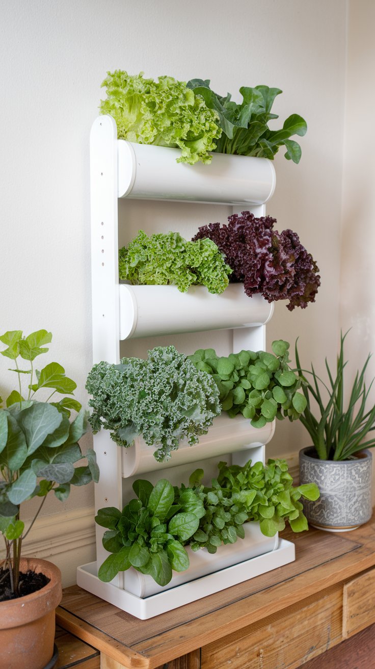 Grow small tomatoes and bell peppers in a compact vegetable tower. Position it near a bright window and use nutrient-rich soil for healthy growth. Support the plants with stakes as they grow taller to ensure stability.