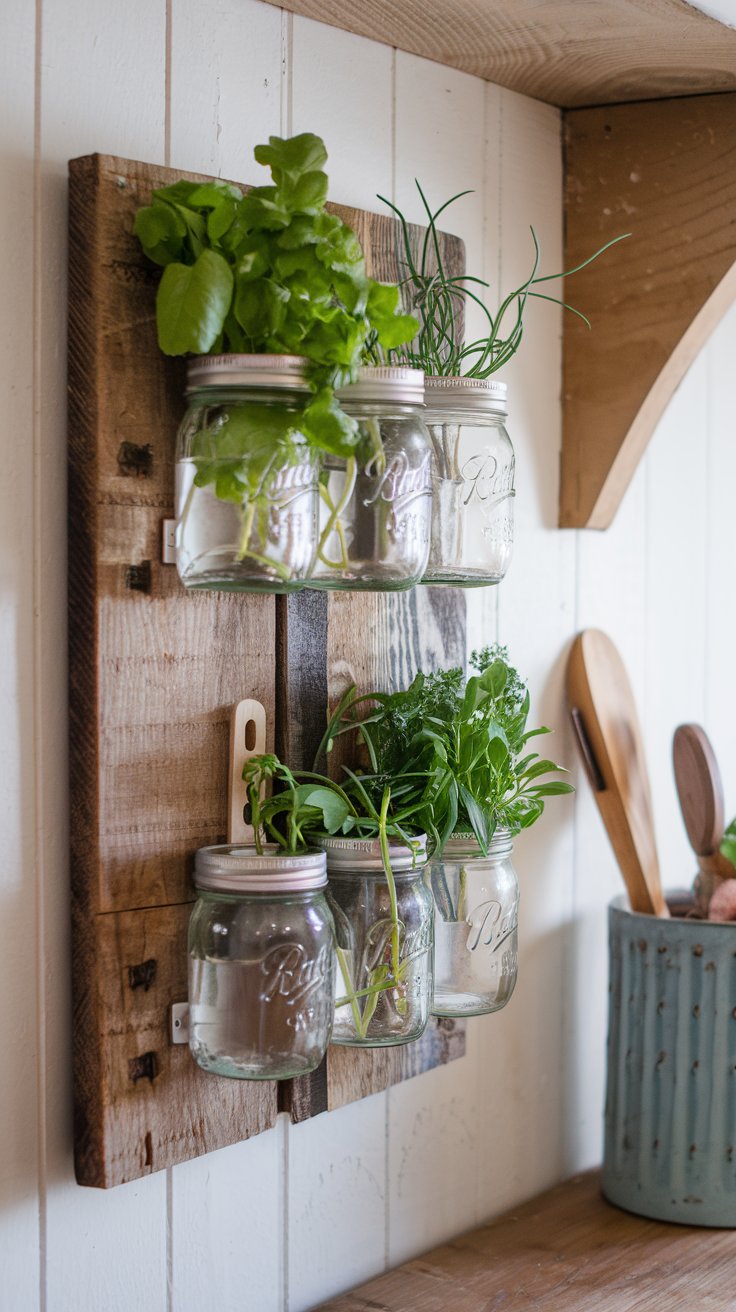 Mount mason jars on a reclaimed wooden board for a charming herb garden. Grow kitchen staples like basil, dill, and cilantro. Ensure proper drainage by adding small pebbles at the bottom of each jar and hang them in a sunny spot.