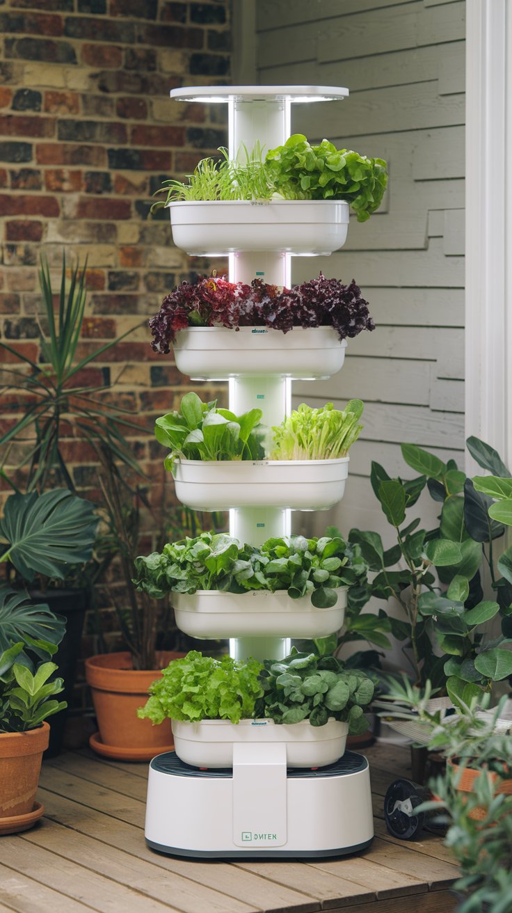 Maximize space with a rotating vertical garden tower for fresh leafy greens. Its rotating design ensures even light exposure for all plants. Opt for hydroponic trays for an efficient, soil-free gardening experience.