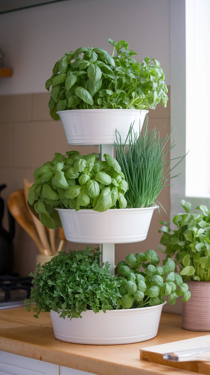 Grow fresh cooking essentials like basil, parsley, and chives with a tiered herb tower. Choose a design with drainage trays to prevent waterlogging. Position the tower near a kitchen window for easy access and ample sunlight.