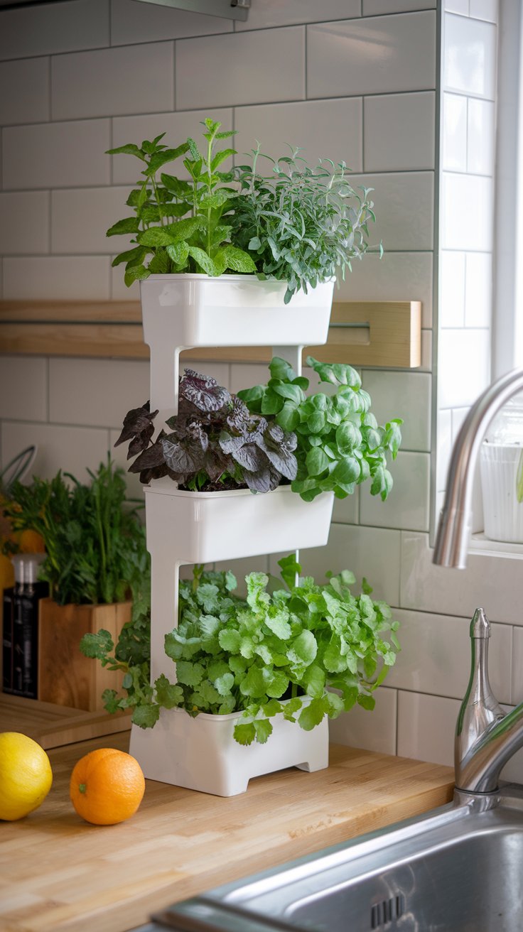 Create a kitchen masterpiece with a stylish herb tower featuring mint, oregano, and parsley. Keep it near the countertop for easy access while cooking. Use self-watering planters to keep your herbs thriving with minimal effort.