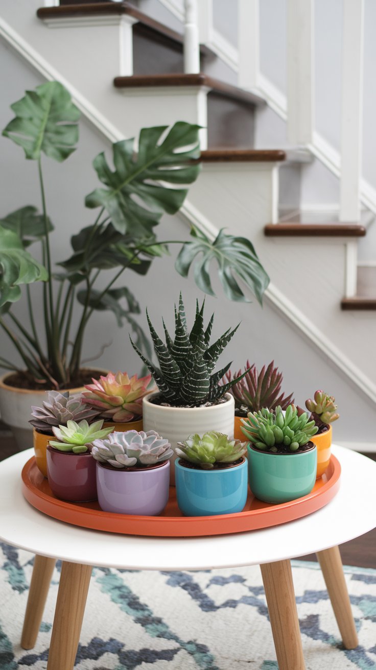 Brighten up your coffee table with a succulent arrangement in vibrant pots. Combine succulents of varying heights and textures for visual interest. Add decorative stones or sand for a polished look, making your centerpiece both stylish and low-maintenance.