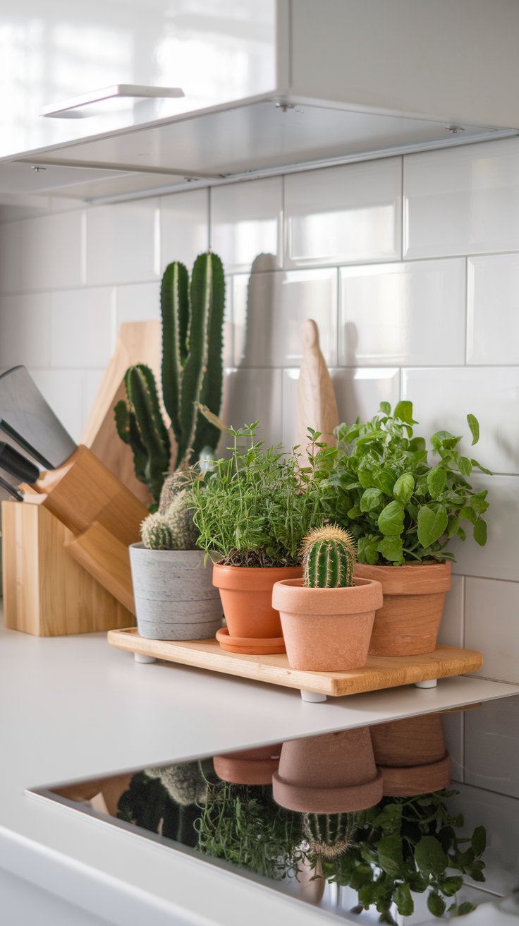 Enhance your kitchen décor with fresh potted herbs displayed alongside sleek appliances. Use uniform, modern pots for a minimalist look and place herbs like chives, parsley, and basil within arm s reach of your cooking area.