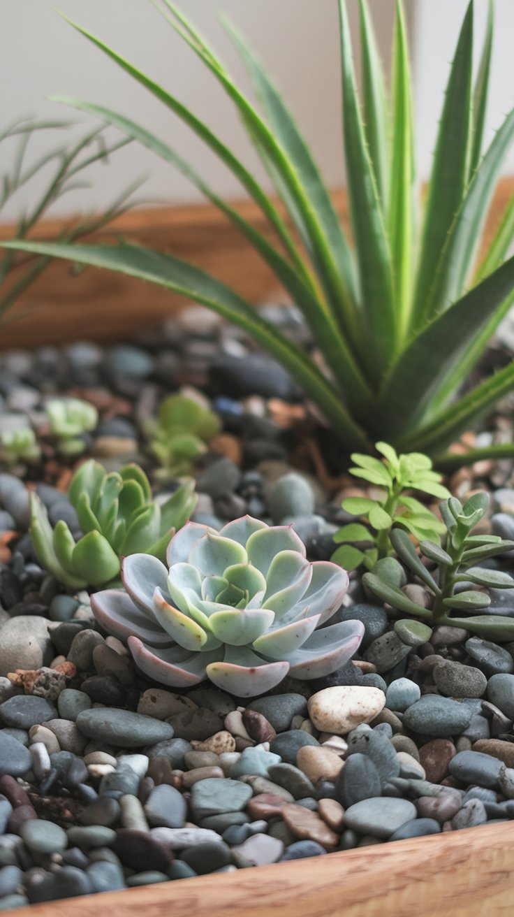 Create a calming Zen garden with succulents nestled in smooth stones. Use shallow bowls for a harmonious aesthetic and place the garden on a desk or table to encourage mindfulness and relaxation.