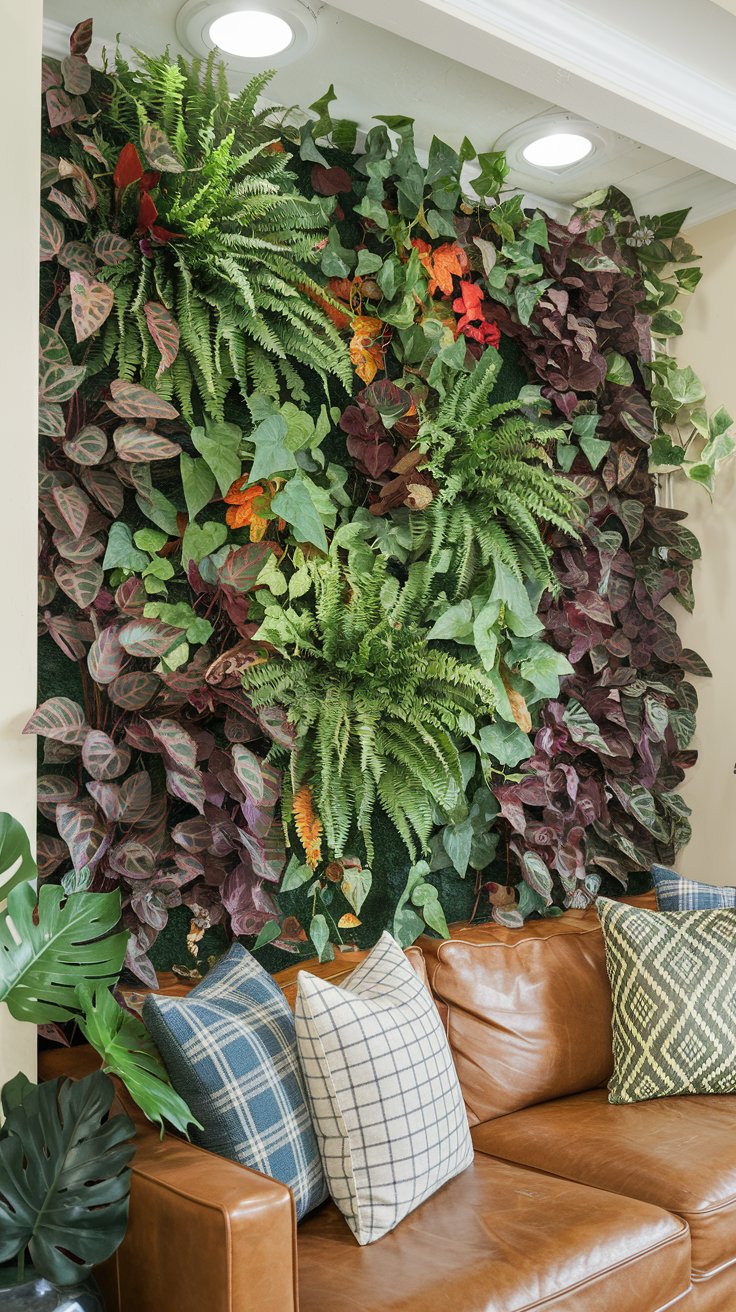 Transform your living room into a natural oasis with a green wall filled with ferns and ivy. This eye-catching feature purifies air and adds a calming vibe. Incorporate automatic watering systems and indirect lighting to maintain the plants health.