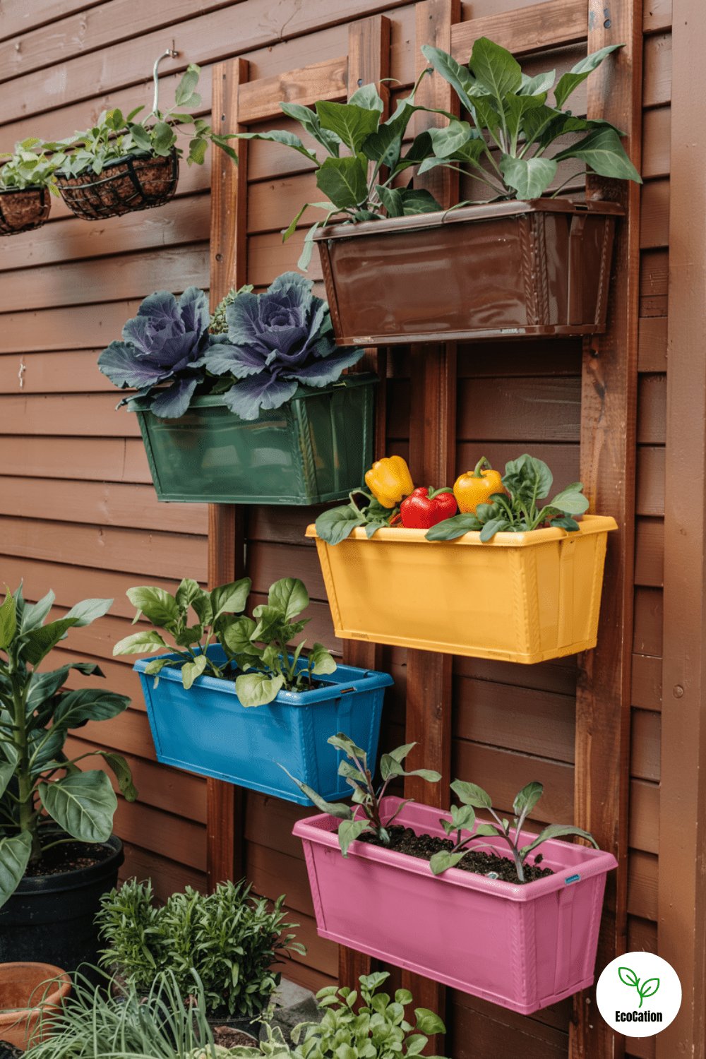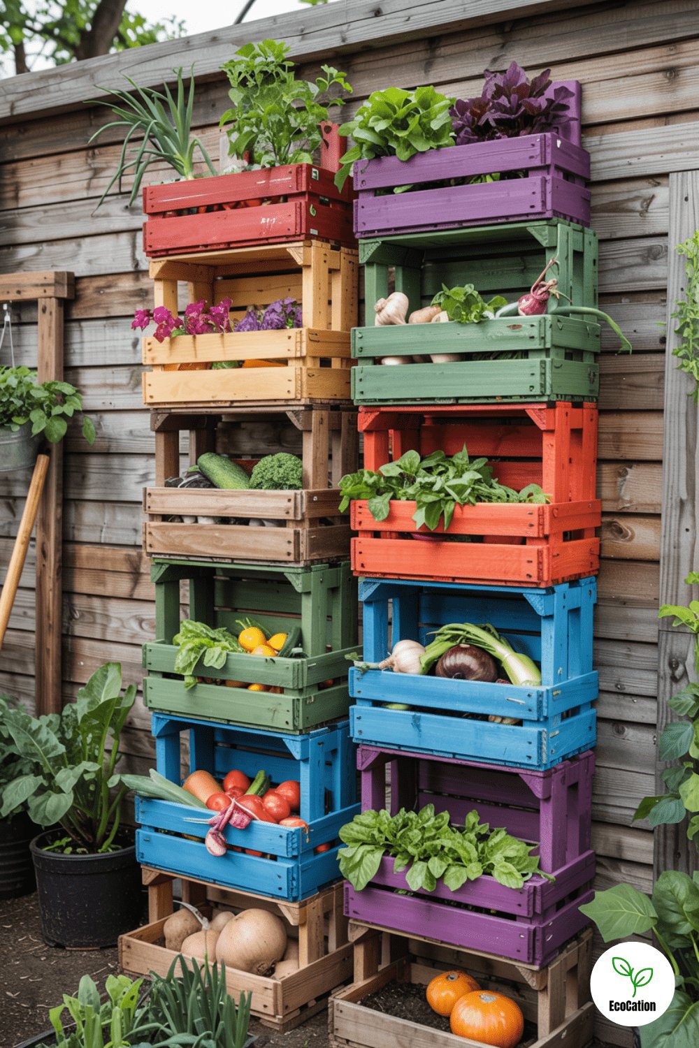 Stacked rainbow crates filled with vegetables bring a playful, DIY vibe to vertical gardening. Drill drainage holes, line the crates, and layer them to prevent tipping. This is a great weekend project for families and adds a burst of color to any backyard.