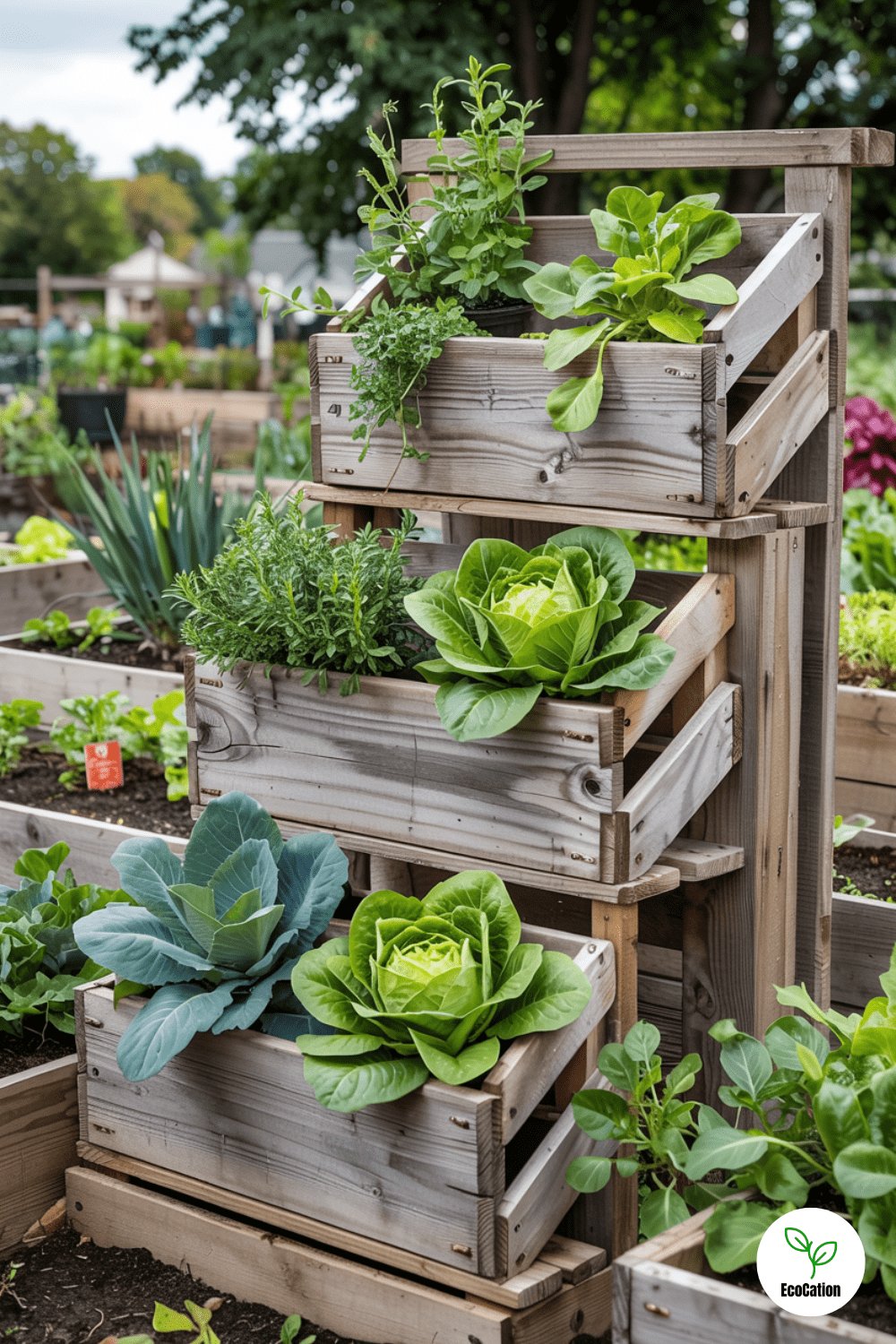 Angled boxes stacked like wooden stairs create a natural tiered garden for romaine, kale, and herbs. It s like a staircase to salad heaven and you ll love how easy it is to water and harvest each layer.