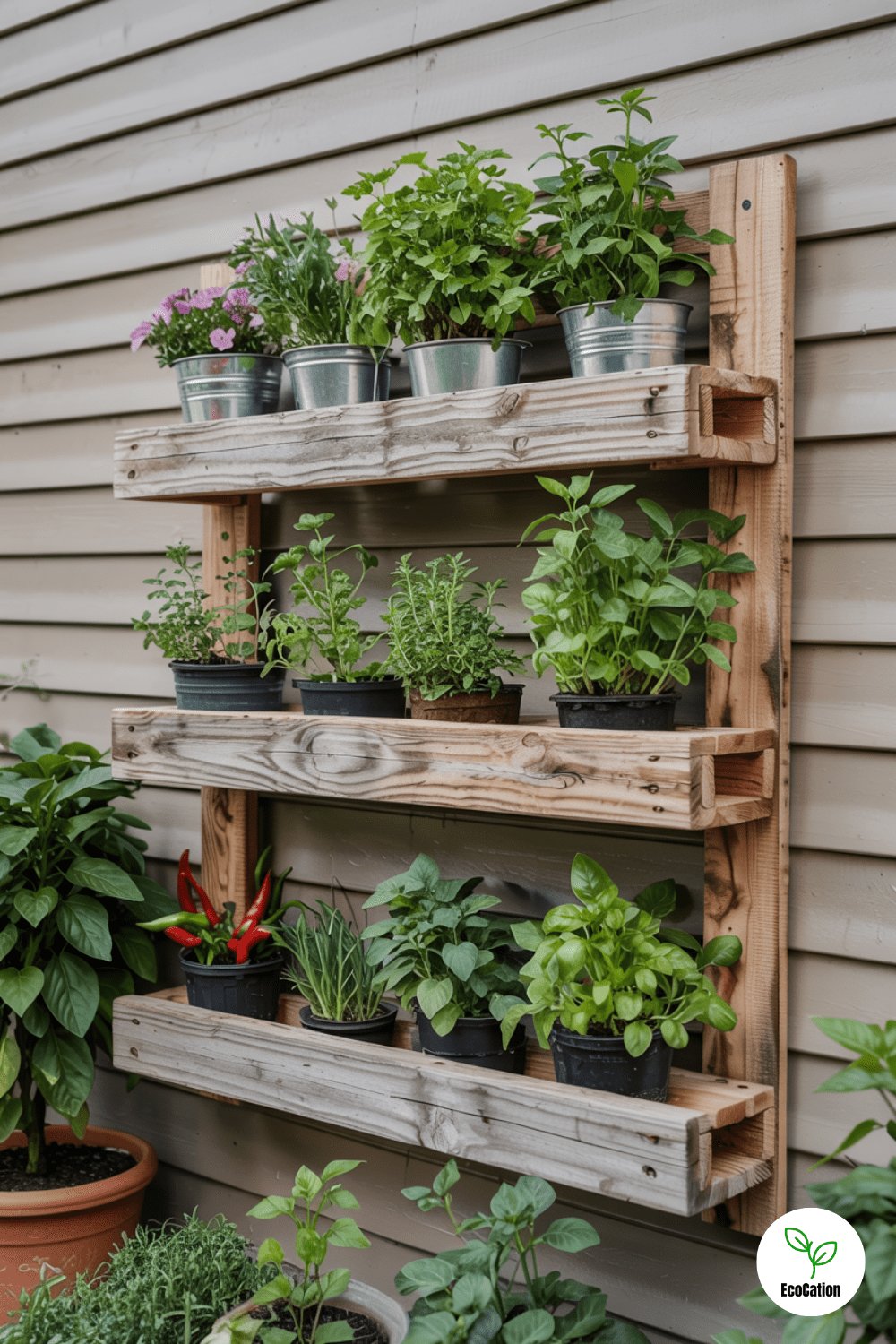 Rustic shelves on an exterior wall make a simple yet effective vertical garden. Mix clay pots with chili plants, thyme, and parsley for an approachable setup that even beginner gardeners will find easy to maintain.