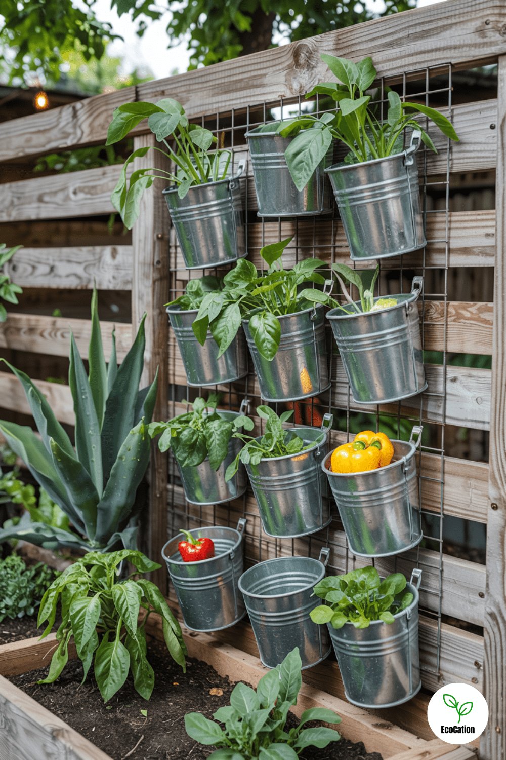 Clip-on metal buckets filled with greens and peppers turn a boring fence into a functional and fun food wall. It s super easy to rearrange and works well for renters or anyone who wants a non-permanent solution.