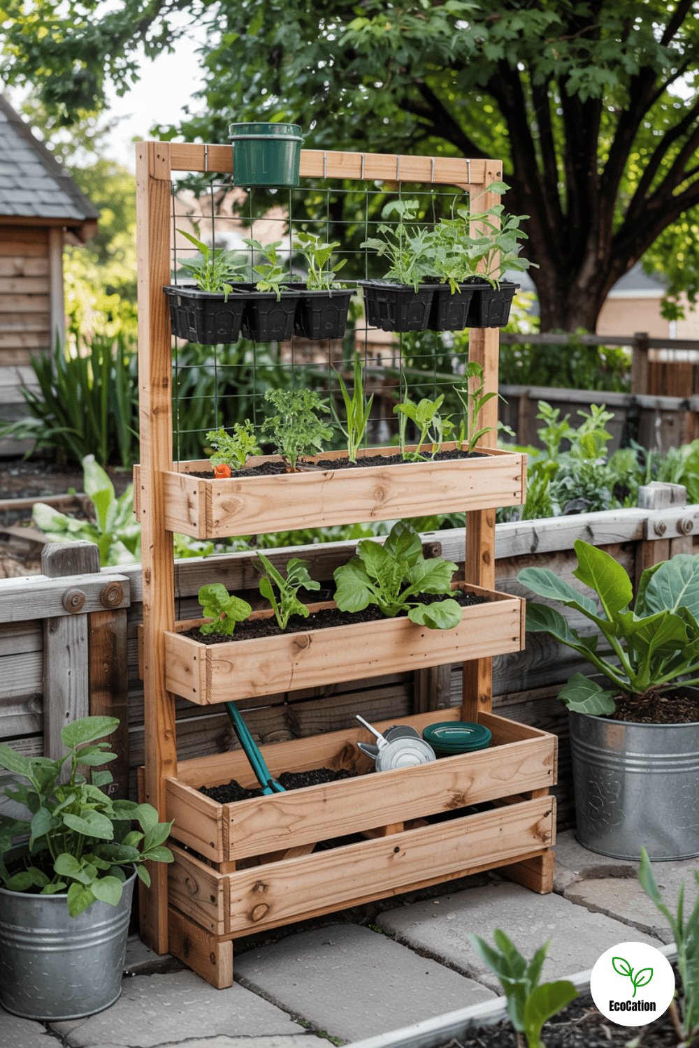 A freestanding garden frame with planting shelves and storage bins means everything is in one place plants on top, tools below. Use shallow containers for herbs and leafy greens, and stash your gloves and watering can underneath.