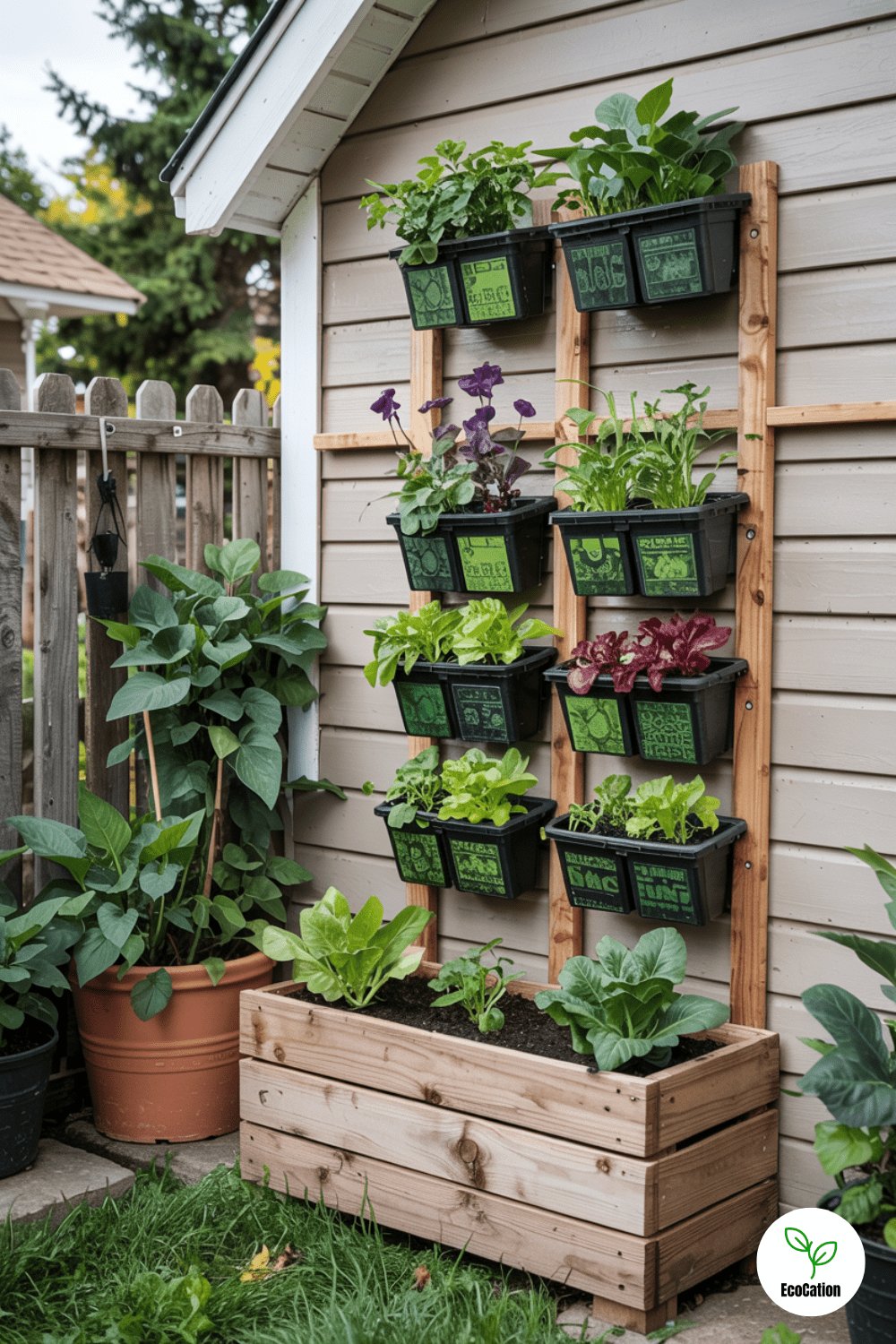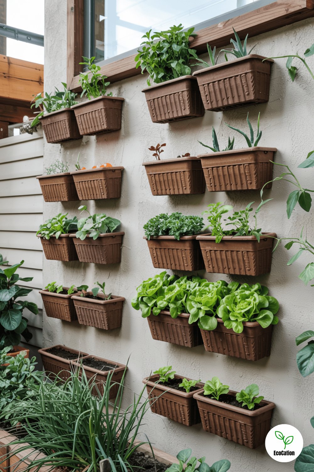 Uniform square planters filled with parsley, lettuce, and mini peppers line a stucco wall in perfect order. It s clean, easy to maintain, and brings a sense of structure to your gardening space. Just water evenly, and enjoy your edible design.