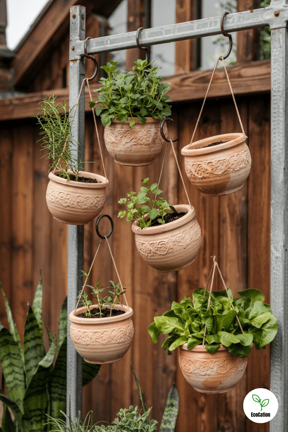 Neutral-toned ceramic pots hanging from sleek rods offer a peaceful, spa-like garden vibe. Perfect for herbs and small greens like lettuce, they bring softness and function to vertical gardening especially on balconies or porches.