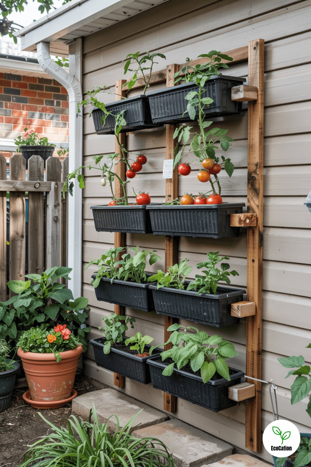 Stacked planter rails are ideal for narrow outdoor walls growing tomatoes and greens in tidy rows. Choose dwarf or patio tomato varieties and add trailing spinach below. It s an efficient use of space and great for regular harvesting.