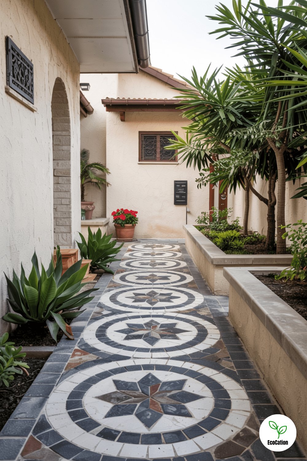 A walkway with colorful mosaic tile patterns adds artistic flair. Use broken ceramic pieces or glass tiles to create swirling designs, and seal them properly for weather resistance. This vibrant path becomes a focal point in any garden.
