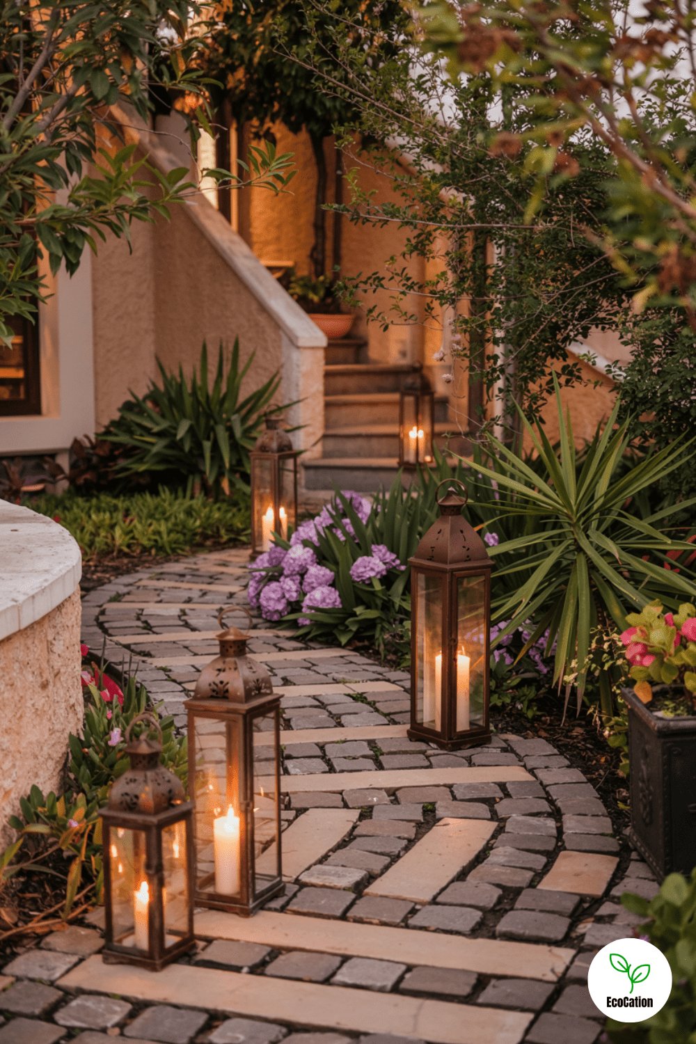 A cobblestone path lined with antique-style lanterns casts a warm, inviting glow. Choose lanterns with flickering LED candles for safety, and let climbing roses or ivy soften the edges. This romantic design is perfect for evening garden strolls.