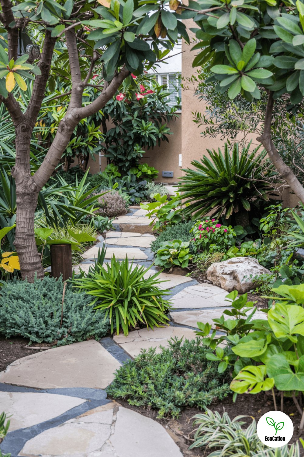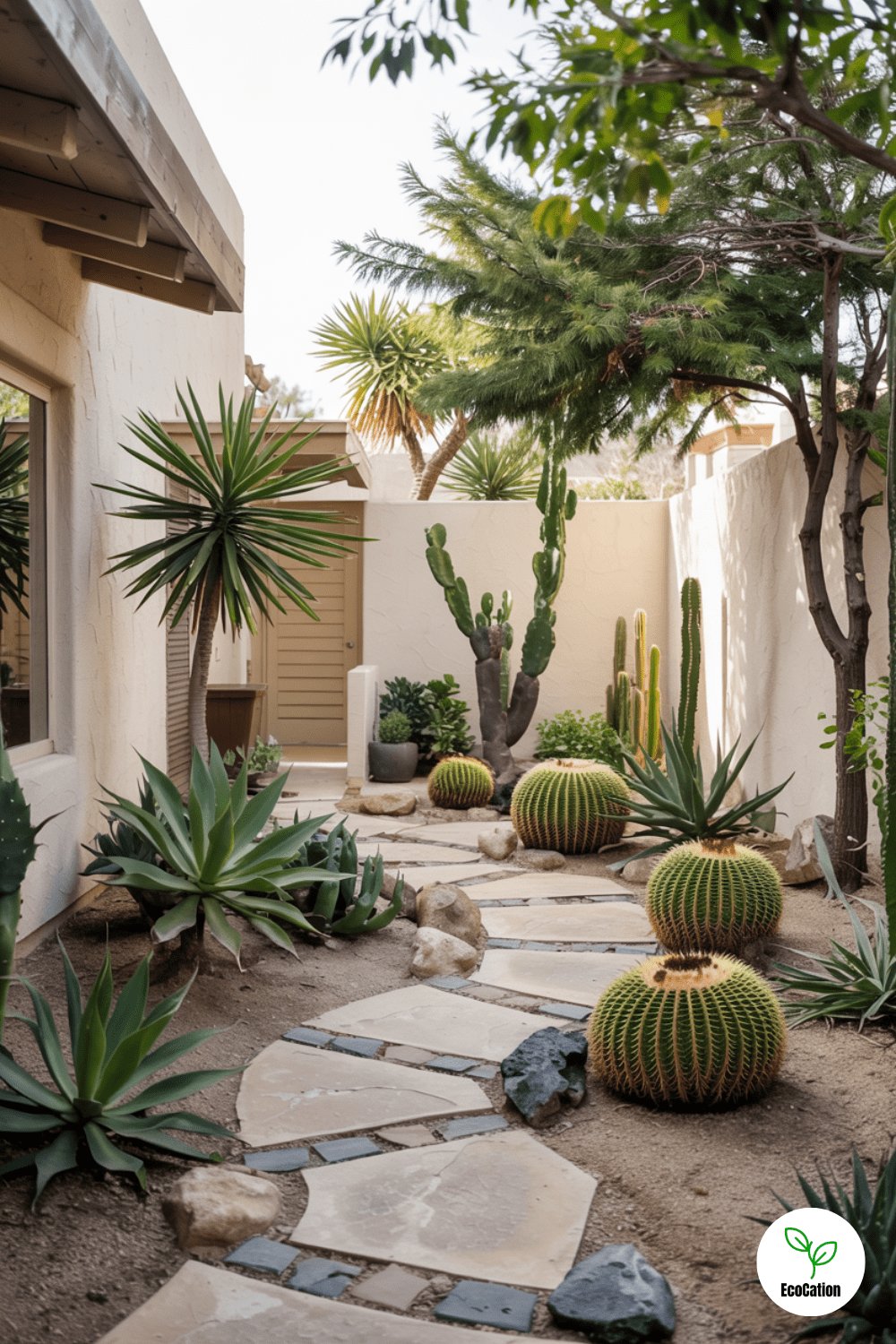 A walkway through drought-resistant cacti and succulents offers stylish sustainability. Use decomposed granite or flagstones, and plant agaves, yuccas, and sedums for texture. This low-water design thrives in hot climates while looking effortlessly chic.
