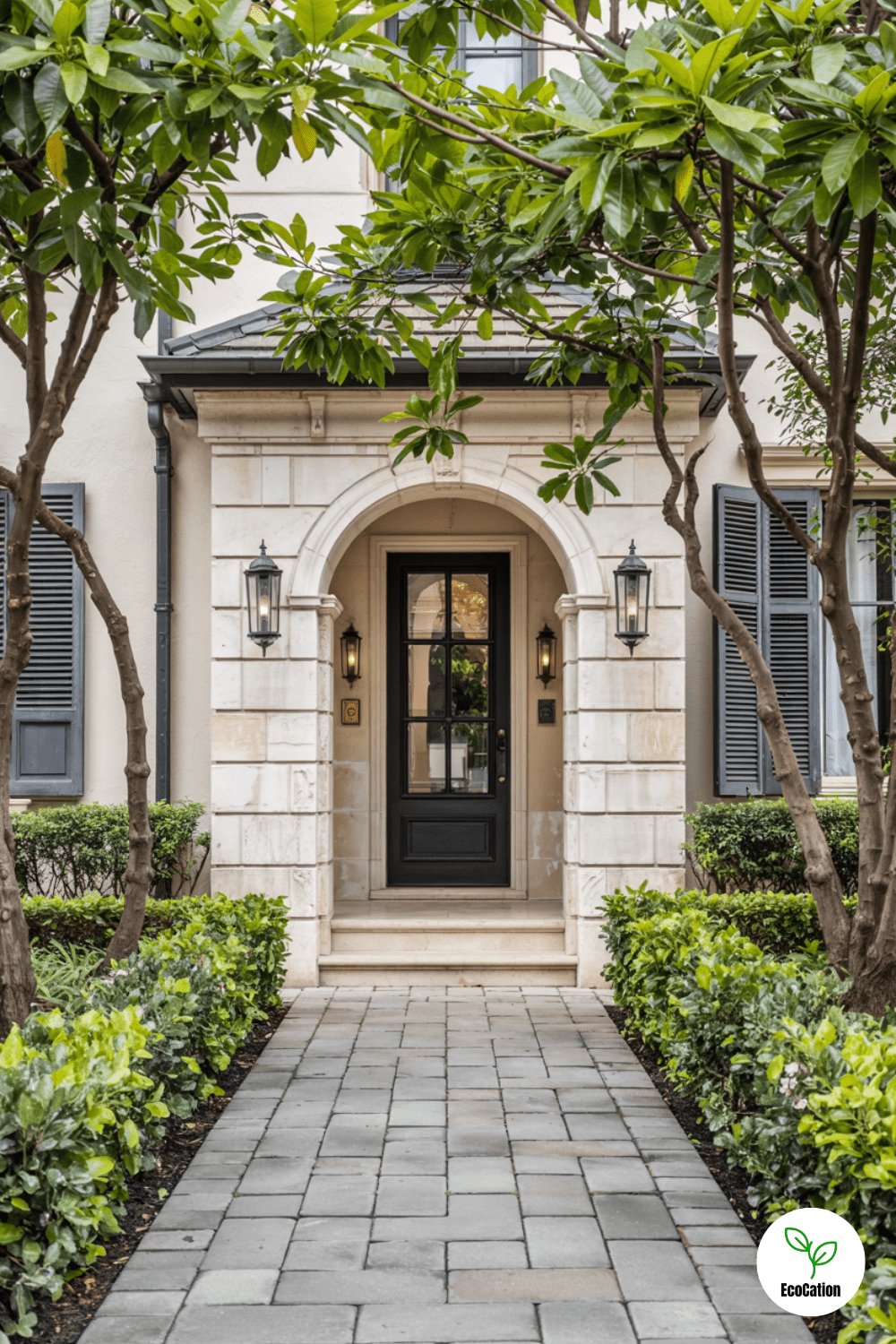 A straight, paved walkway flanked by trimmed hedges offers a formal, polished entrance. Use uniform pavers or poured concrete for clean lines, and add symmetrical plantings like boxwoods for a structured look. Lighting along the edges ensures elegance day and night.