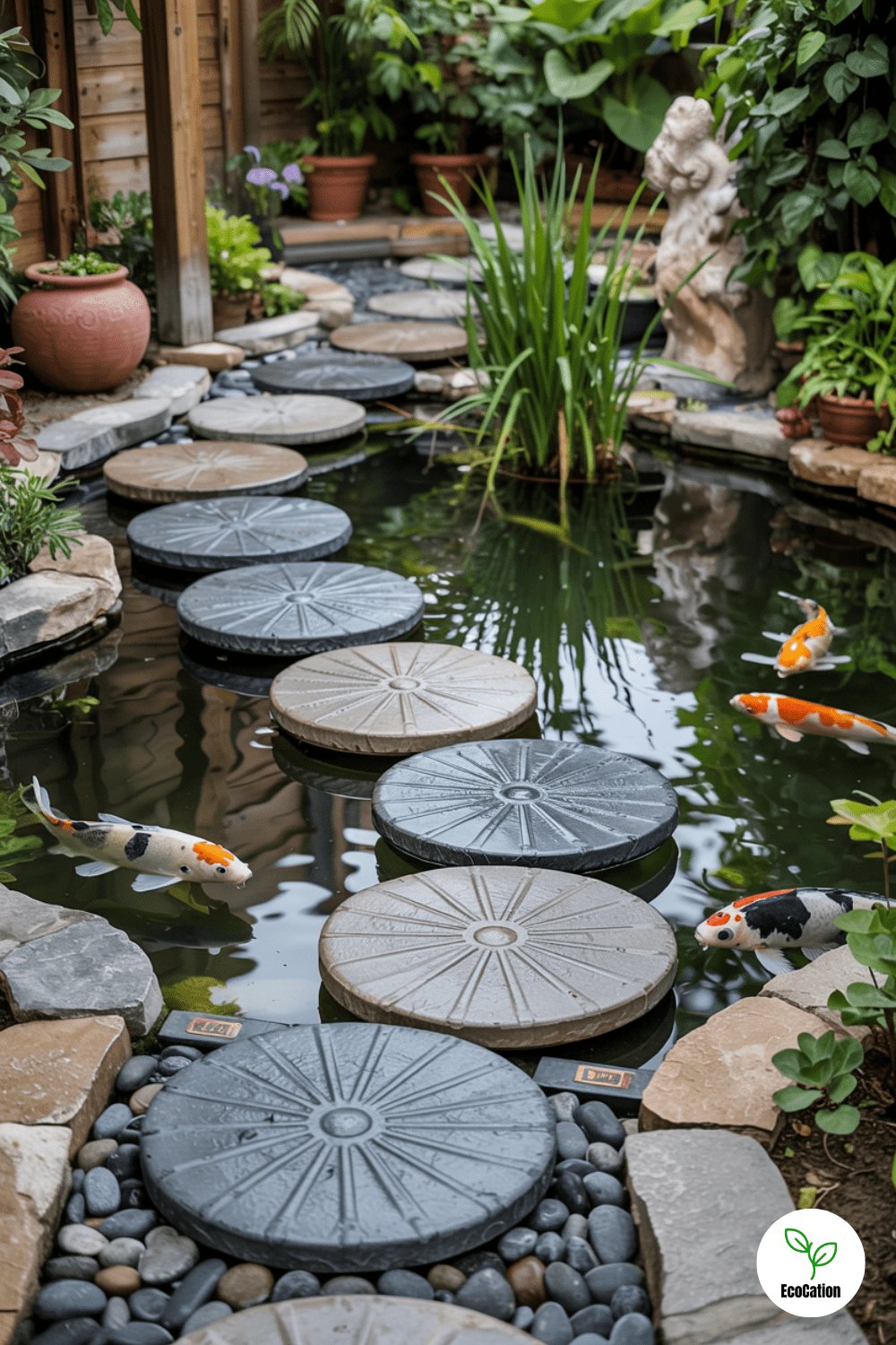 A walkway of stepping stones across a koi pond or small water feature blends stone and liquid tranquility. Use large, flat stones with non-slip surfaces for safety, and space them close enough for comfortable stepping. Surrounding the pond with ferns or water-loving plants enhances the serene atmosphere.