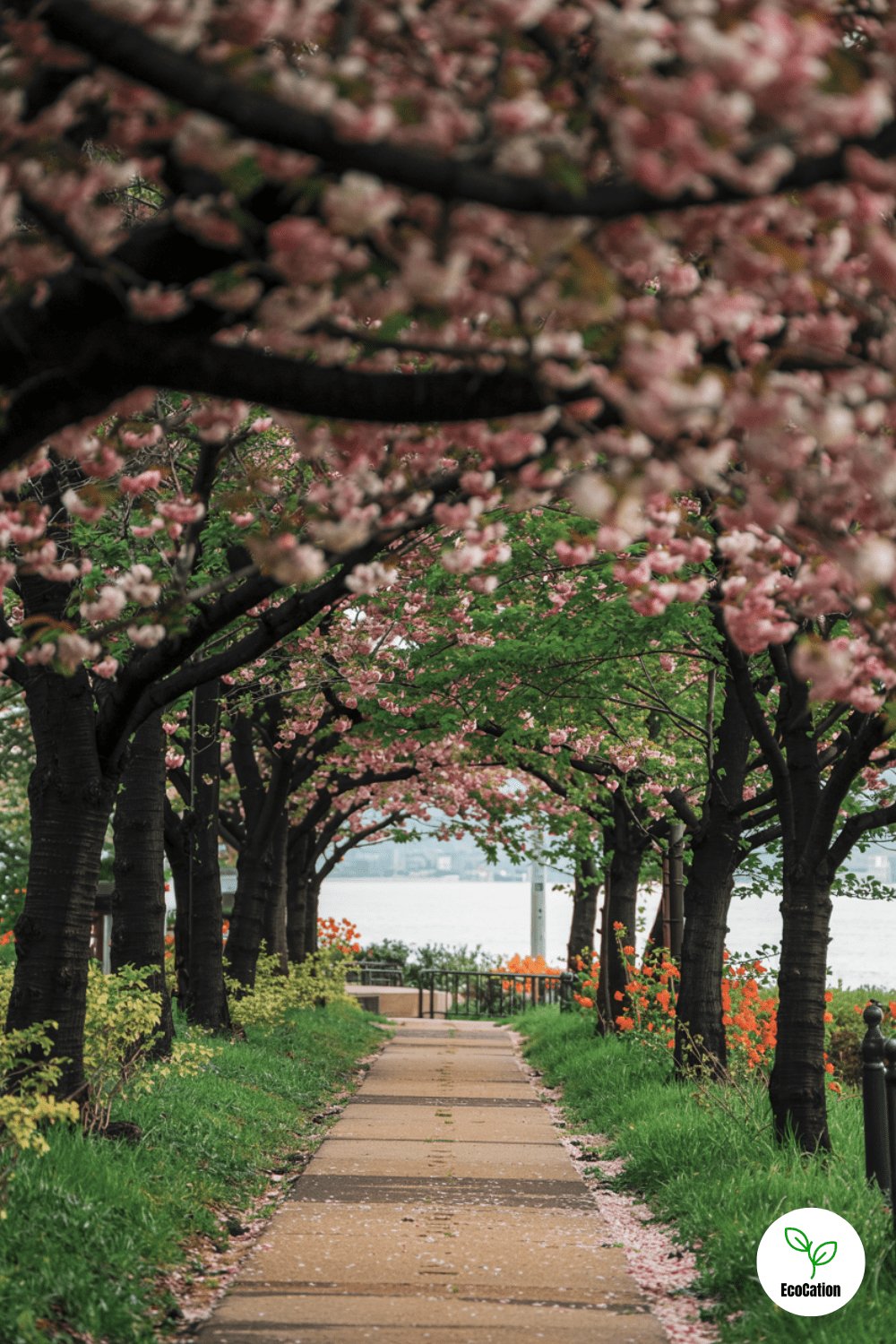 A walkway blanketed in delicate cherry blossom petals is pure spring magic. Plant a flowering cherry tree nearby so falling petals naturally decorate the path. Pair it with smooth paving stones or light-colored gravel to contrast the soft pink blooms.