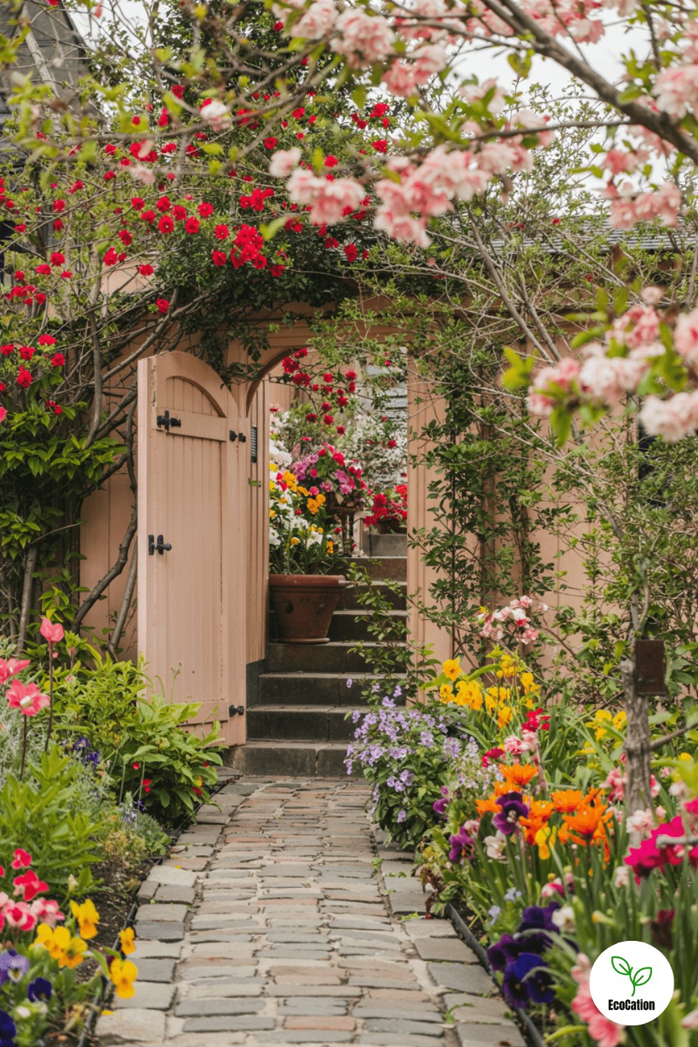 A cobblestone path lined with colorful flowers creates a storybook entrance. The uneven, textured stones add old-world charm, while seasonal blooms like hydrangeas or peonies bring bursts of color. For stability, set cobblestones in sand or mortar, and choose low-growing flowers to avoid overcrowding the walkway.