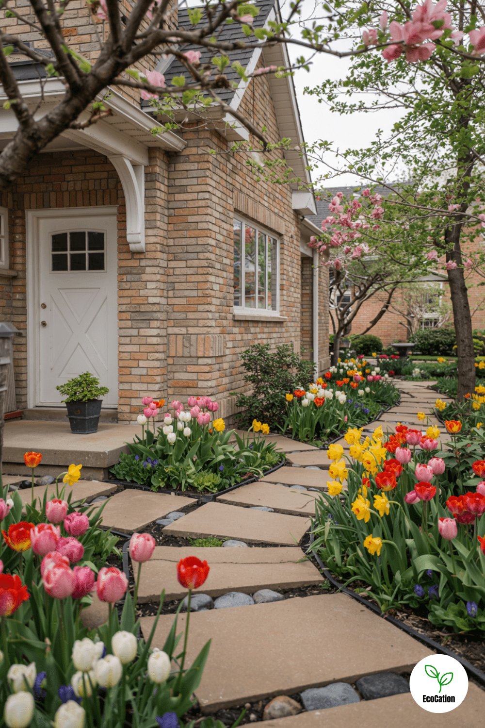 A spring walkway bursting with tulips and daffodils brings cheerful color. Plant bulbs in clusters along the edges of a gravel or brick path for a vibrant seasonal display. For continuous blooms, mix early and late-flowering varieties.