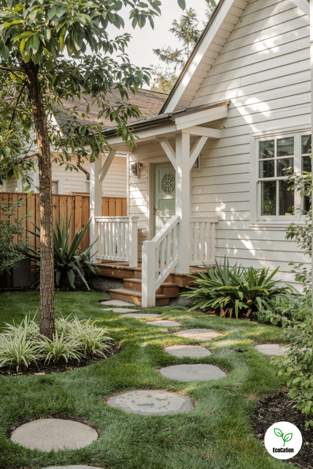 Irregular stepping stones set into a lawn create a playful, natural look. Choose stones large enough to step comfortably, and space them for a casual stride. This design blends structure and softness, perfect for cottage gardens or family-friendly yards.