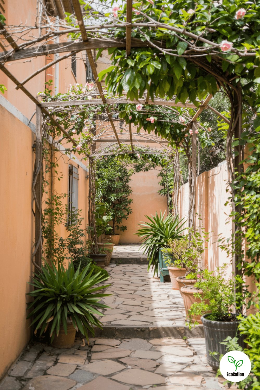 A narrow path under an arching canopy of vines feels like stepping into a secret garden. Grow fast-climbing plants like wisteria, clematis, or grapevines over a sturdy metal or wooden arbor. Keep the walkway itself simple flagstones or packed earth to let the greenery shine.