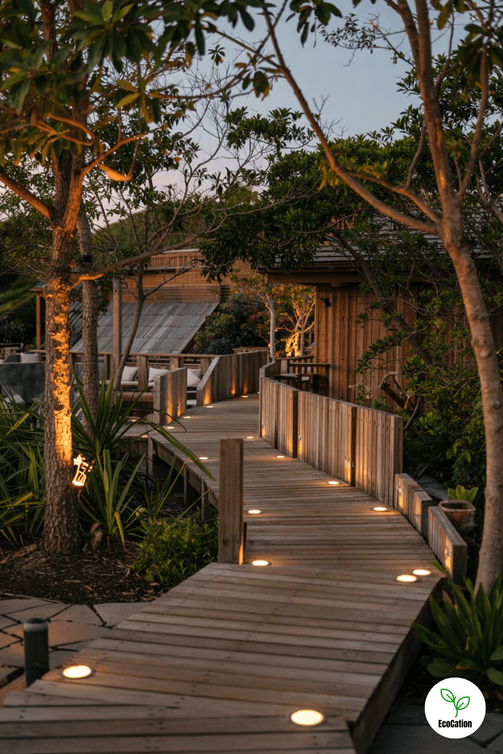 A wooden boardwalk with soft ambient lighting makes evening strolls magical. Use weather-resistant cedar or composite decking for durability, and install solar-powered lanterns or recessed LED lights along the edges. This design works wonderfully in garden spaces with slight elevation changes, adding both function and romance to your backyard.