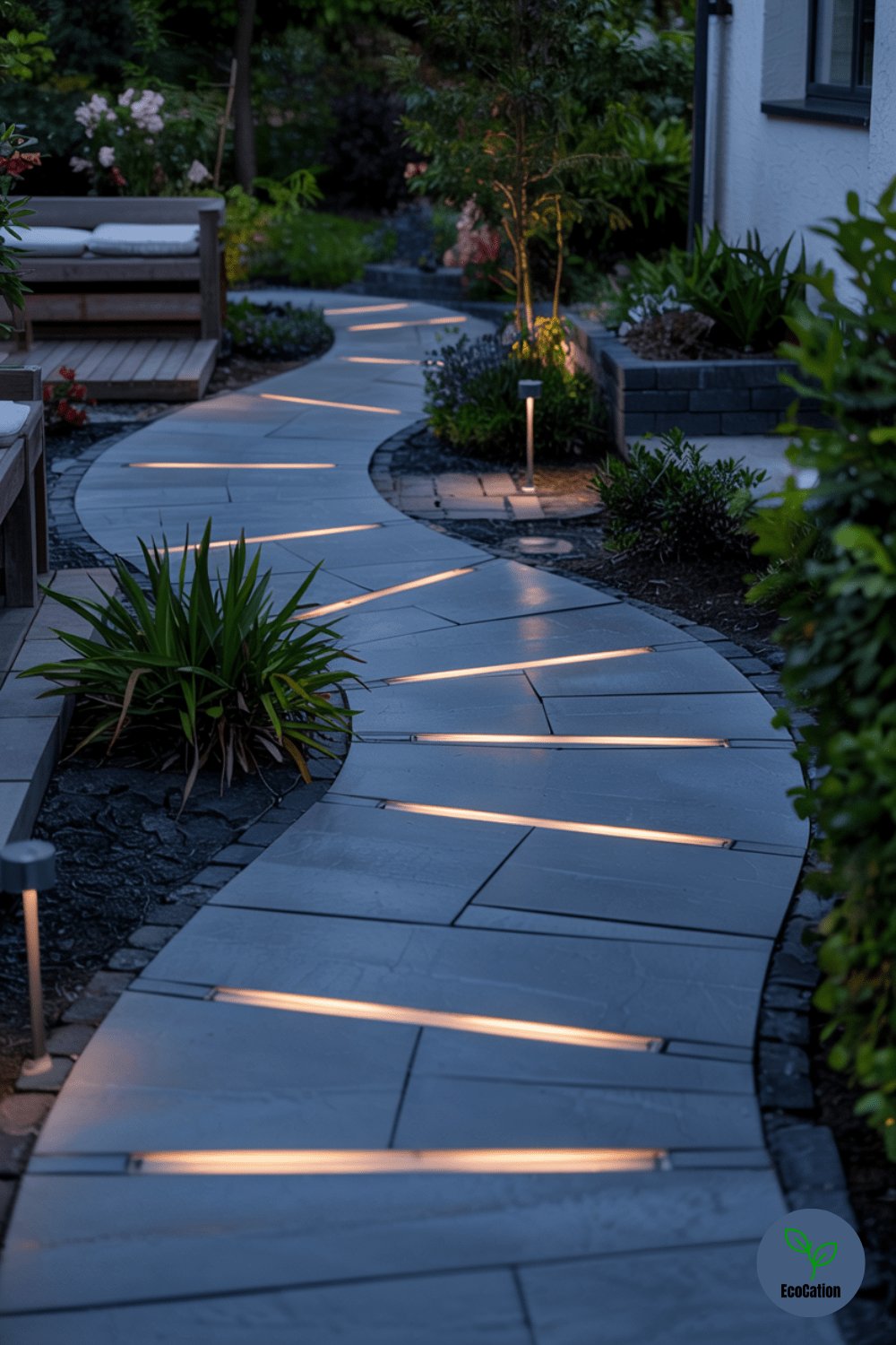 A sleek walkway with embedded LED strips offers a modern, high-tech vibe. Choose dark stone or concrete for contrast, and opt for warm white or soft blue lighting for a subtle effect. This design works well in contemporary gardens or as a striking front entry path.