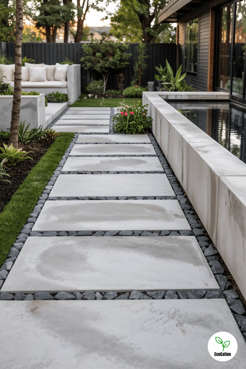 For a sleek, modern look, a concrete walkway with geometric patterns makes a bold statement. Stamped or stained concrete can mimic more expensive materials while offering durability. Pair it with minimalist landscaping think ornamental grasses or sculptural shrubs to keep the focus on the striking pathway design.