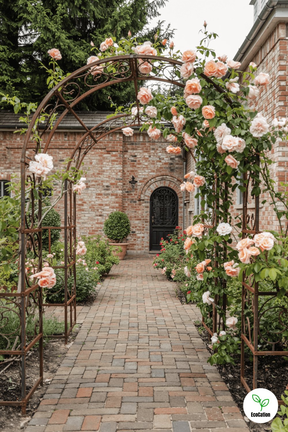 A brick path leading under a wrought iron arch dripping with climbing roses is pure romance. Choose repeat-blooming varieties like New Dawn or Climbing Iceberg for months of flowers. Keep the bricks neatly mortared for a polished look that contrasts with the lush blooms.