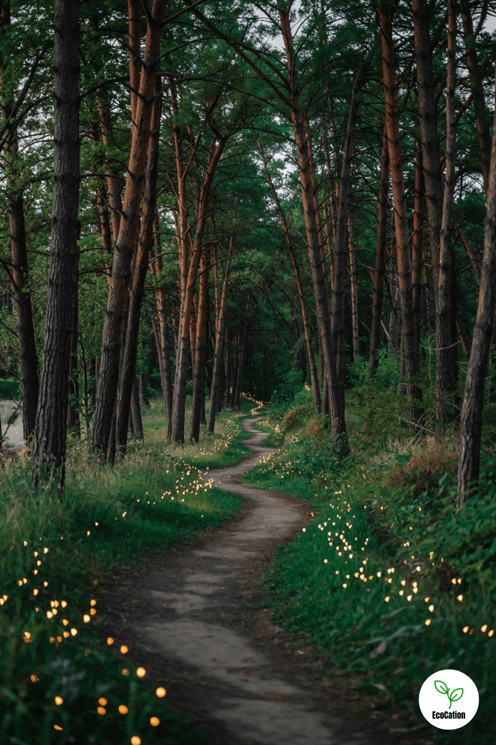 A winding dirt trail illuminated by the soft glow of fireflies (or subtle fairy lights) creates an enchanting nighttime walk. Use solar-powered ground lights to mimic fireflies, and let native plants grow slightly wild along the edges for a truly magical woodland feel.