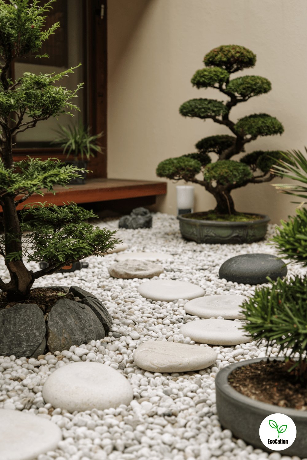 White pebbles raked into smooth patterns, paired with bonsai trees or ornamental grasses, create a minimalist Zen garden walkway. This design promotes calm and requires little upkeep just occasional raking to maintain the serene aesthetic. Add a stone bench for quiet contemplation.