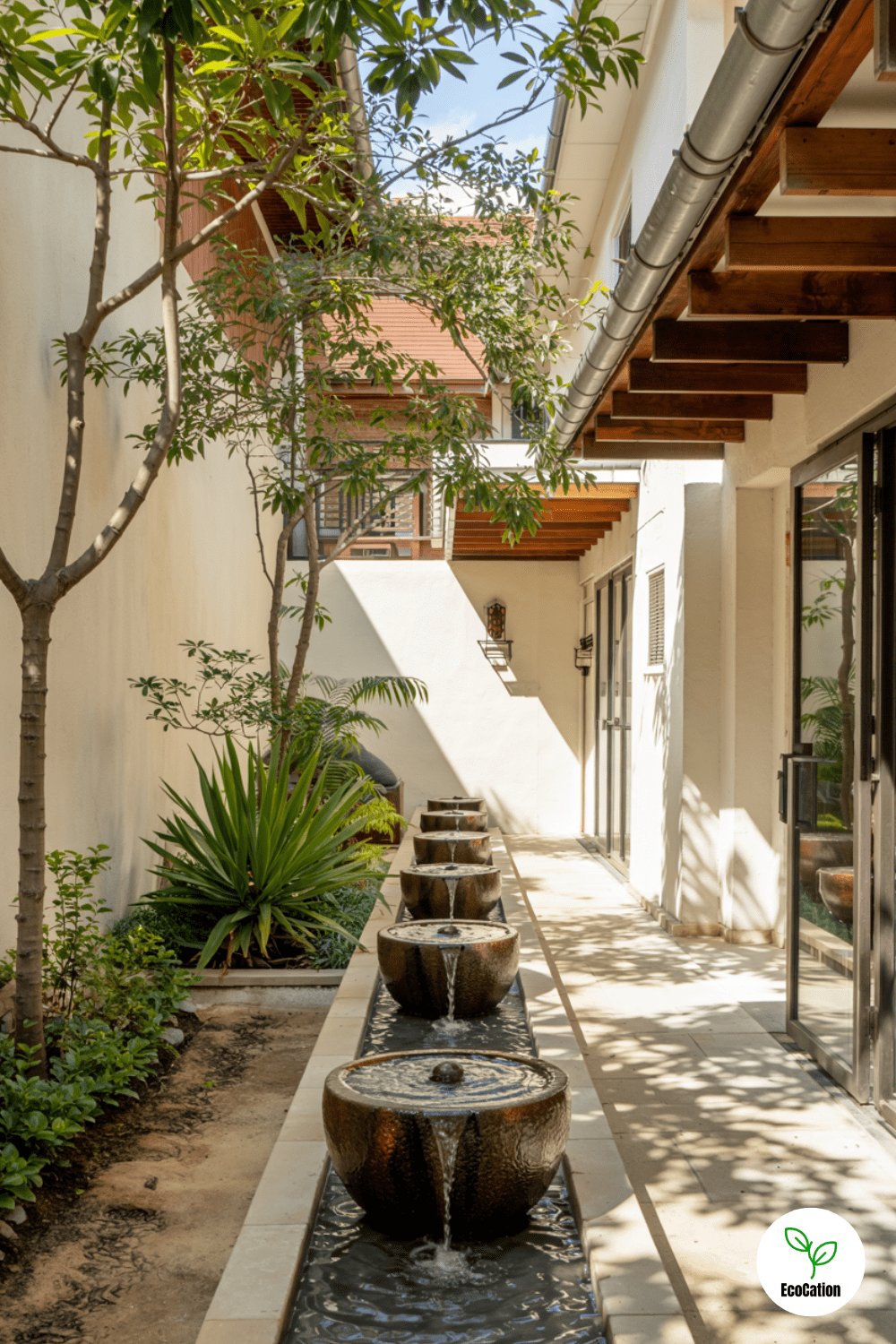 A walkway with a small water feature running alongside adds soothing movement and sound. Use river rocks to edge a recirculating stream, and pair it with smooth slate stepping stones. The sound of trickling water makes this path perfect for meditation gardens.