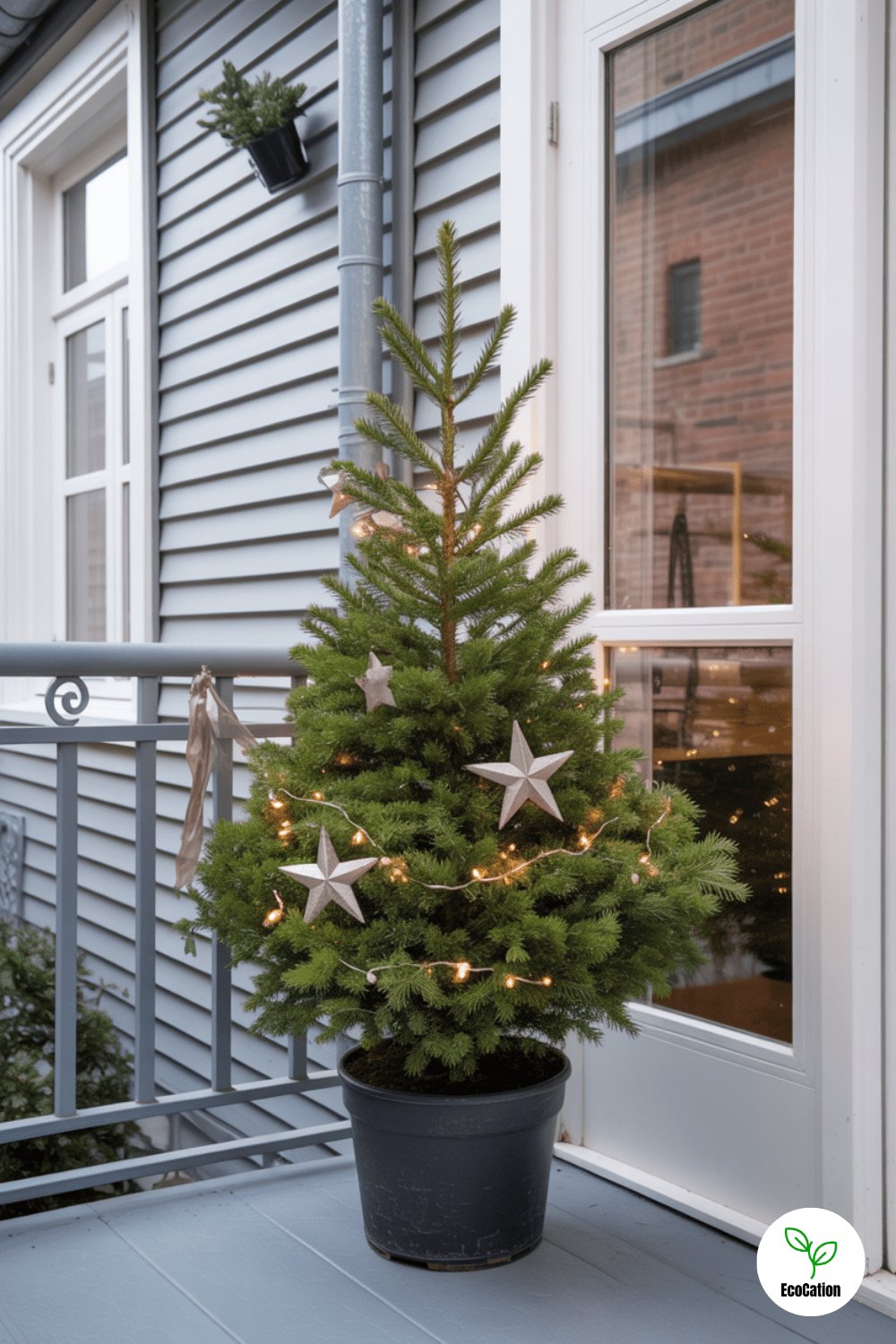Even the smallest apartment balcony deserves a little Christmas magic, and a small, potted evergreen is the perfect solution. Keep it simple and stress-free by decorating minimally with battery-operated lights and a few metallic stars. Battery packs are a lifesaver for spaces without easy outdoor outlets, proving that porch Christmas tree charm fits any size space.