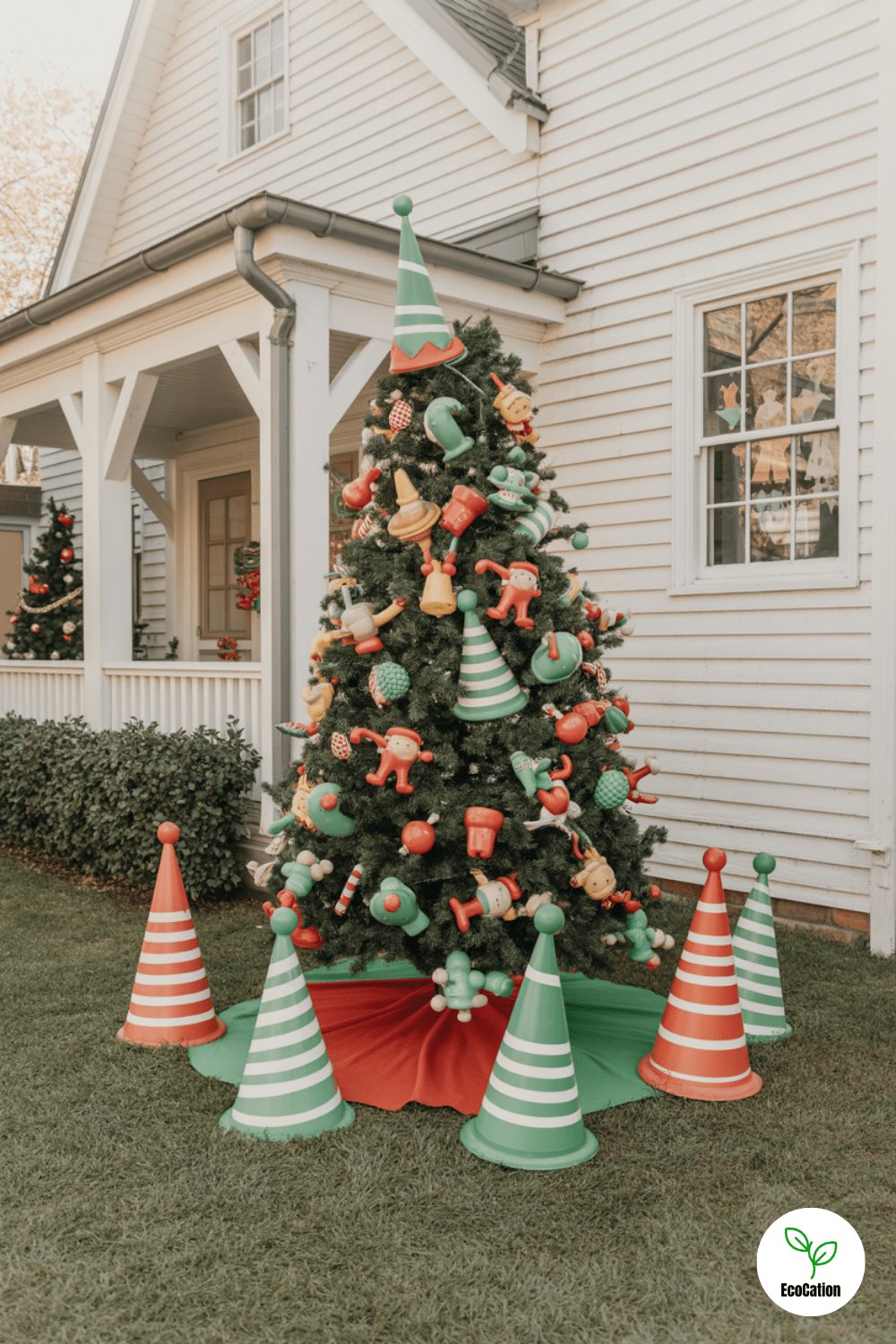 If your house is all about fun and family, your outdoor tree should be too! Adopt a playful theme by adorning your tree with brightly colored plastic toys, fun character ornaments, and quirky elf hat accents. This whimsical outdoor setup is instantly joyful and is sure to bring a smile to every child (and adult!) who passes by.