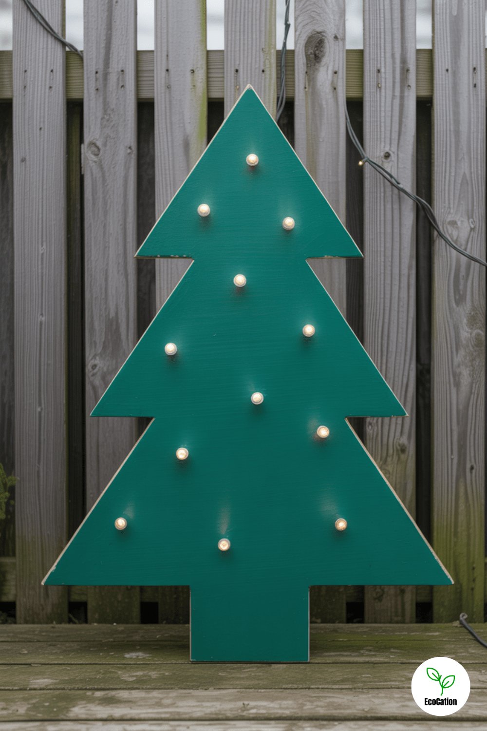 If your style leans modern and sleek, ditch the needles for a minimalist DIY project. Craft a simple plywood Christmas tree shape, paint it green, and drill holes across the surface. Push small outdoor lights through the holes to create a geometric, bright, and unique piece of decor that looks fantastic in a contemporary setting.