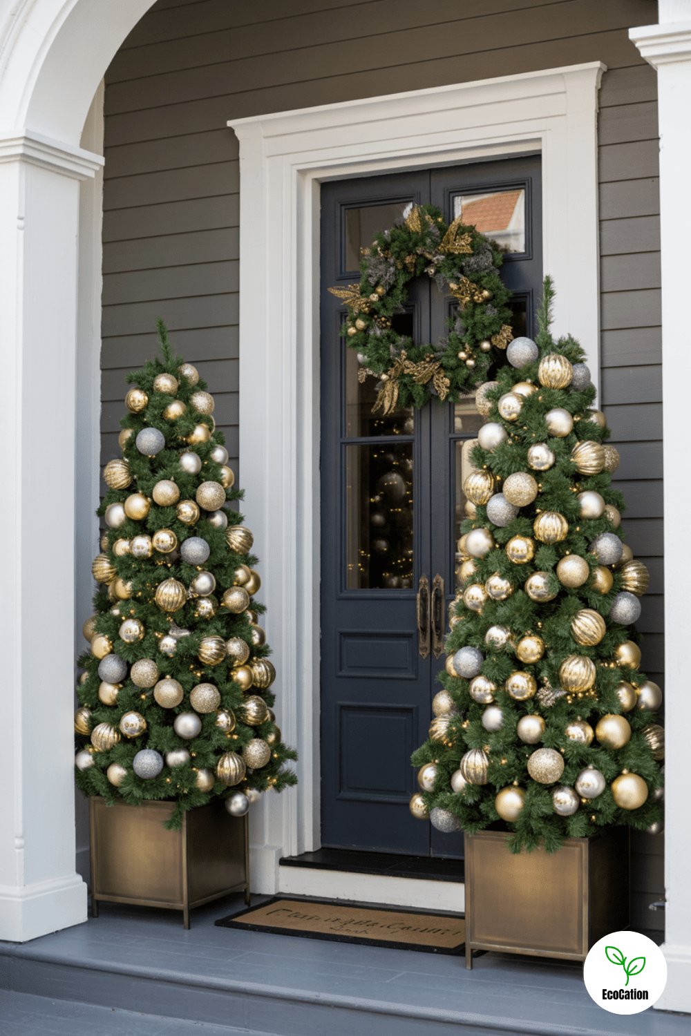 Create a grand entrance that screams luxury Christmas decor by framing your front door with two perfectly symmetrical trees. Place them in matching, upscale bronze planters and cover them lavishly in brilliant gold and silver ornaments. This balanced, polished look gives your home a tailored, high-end feel the moment anyone steps onto your porch.